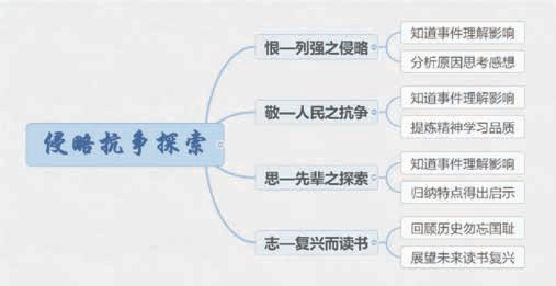 本节课的复习内容围绕四个专题展开,分别是①恨——列强之侵略;②敬——人民之抗争; ③思—— 先辈之探索; ④志—— 读书而复兴。在每个专题的学习过程中, 我按照“ 提问——自学——练习——总结”的学习步骤依次展开,让同学们循序渐进的掌握每个专题的要点。