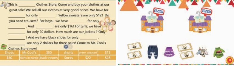 活动设计:提前在希沃云空间布置作业来引导学生得出广告写作应写的内容框架中的两项。通过听听力和对答案进行分析,再通过游戏得出:在广告写作中应描写价格和服装。