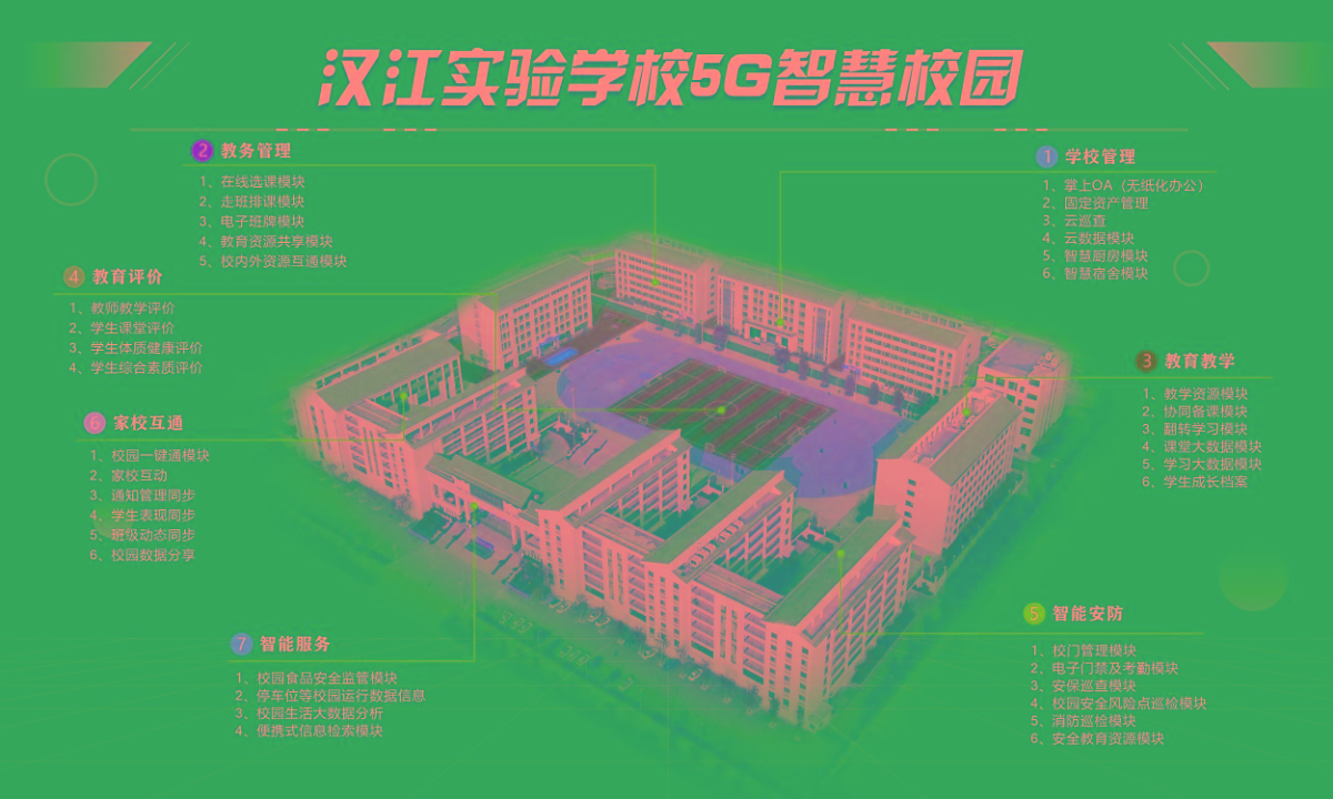 汉江实验学校智慧校园特征:在新的信息技术支持下进行学校管理、教育教学、教育评价、家校互通、智能安防、智能服务等方面的全面变革,打造智慧管理环境。