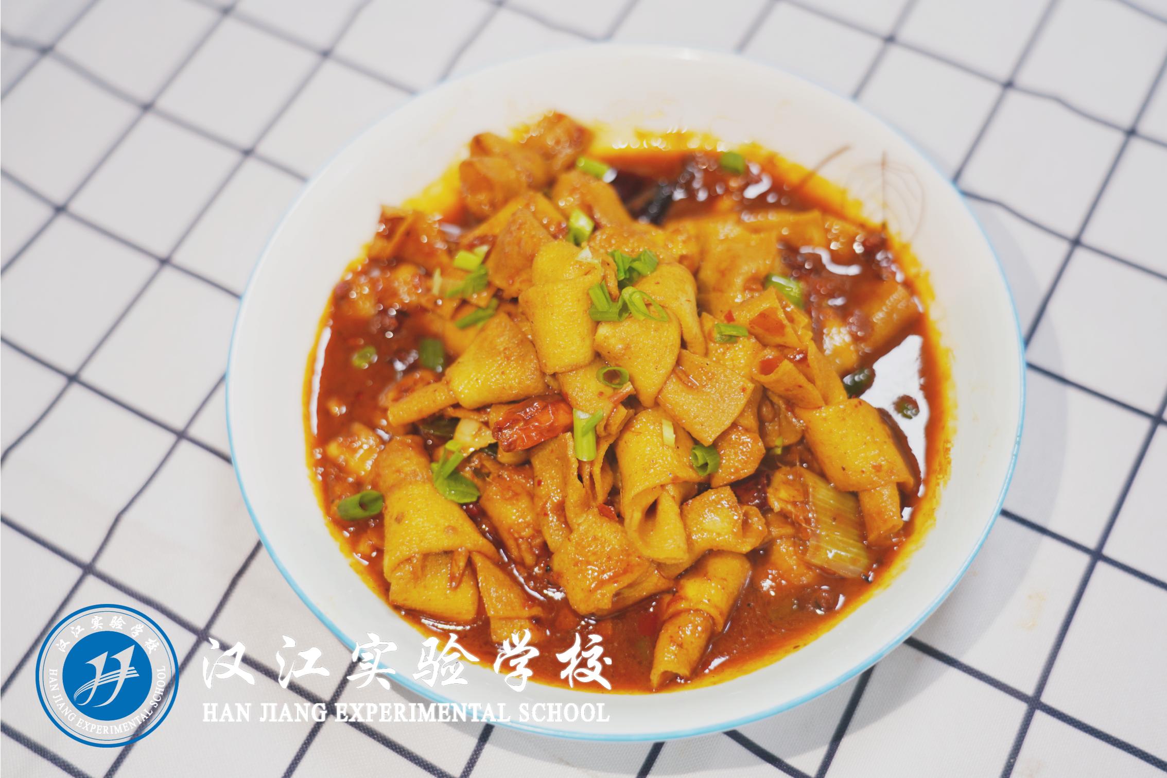 晚餐:米饭、宫爆肉丁、泡椒土豆丝炒肉、炒卤千张丝、黄金小馒头、鱼丸豆腐汤