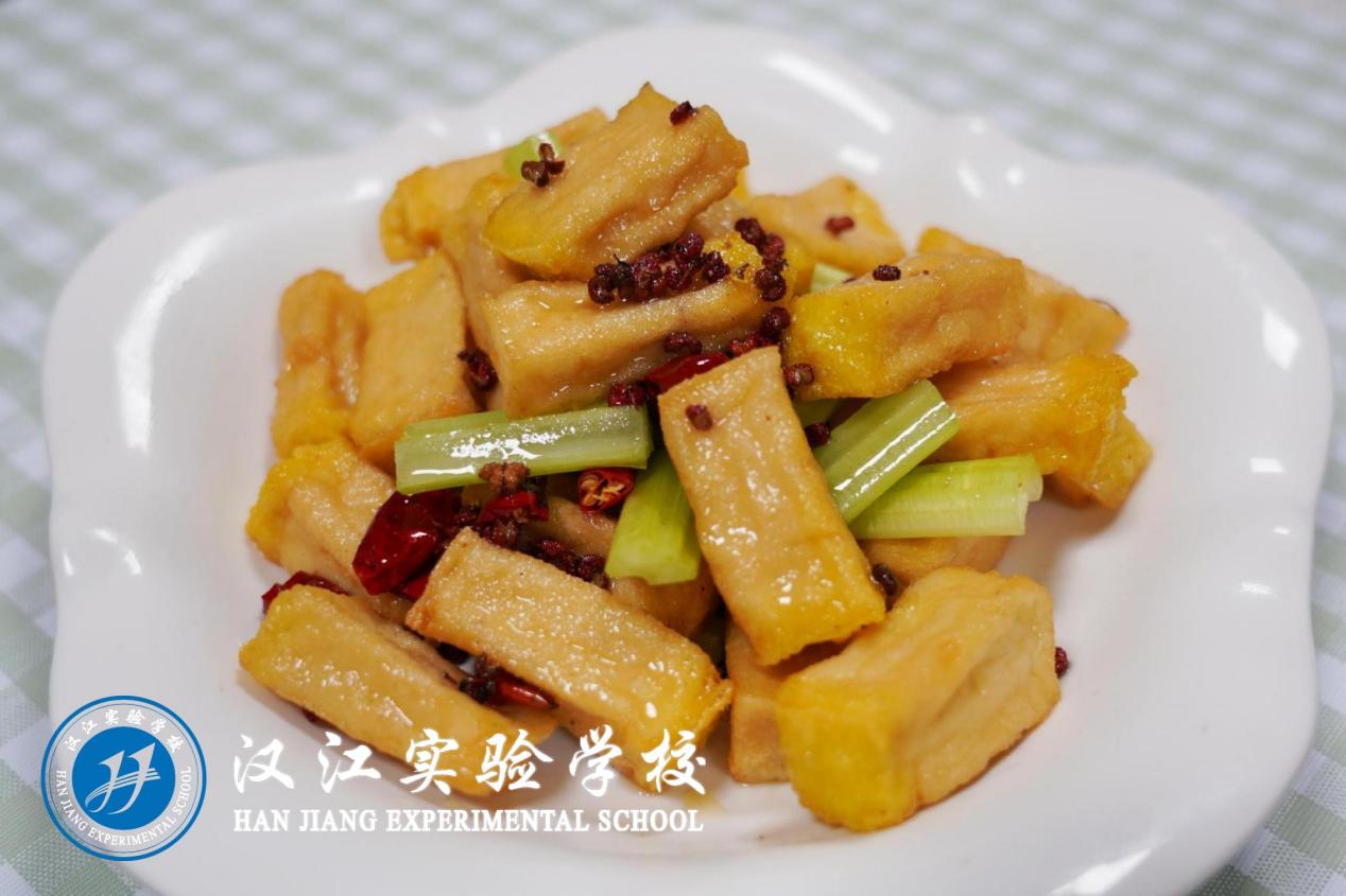 晚餐:五香酥饼、黄瓜条炒肉、烧鱼糕、芹菜炒羊肚丝、米饭、白萝卜腿骨汤