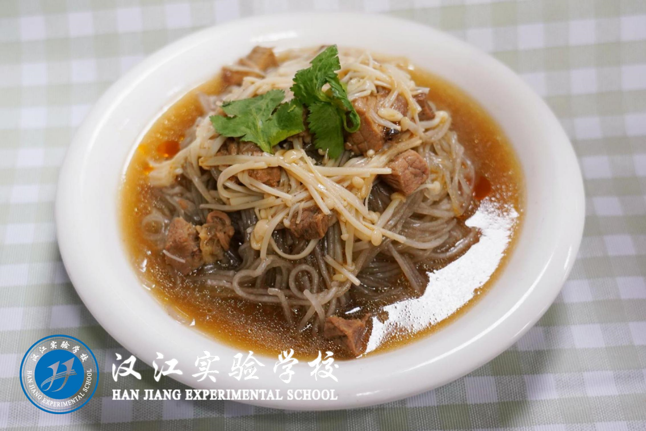 晚餐:香菇牛肉汤粉、炝炒生菜、莴笋炒瘦肉、火烧馍/馒头、绿豆汤(9年级)
