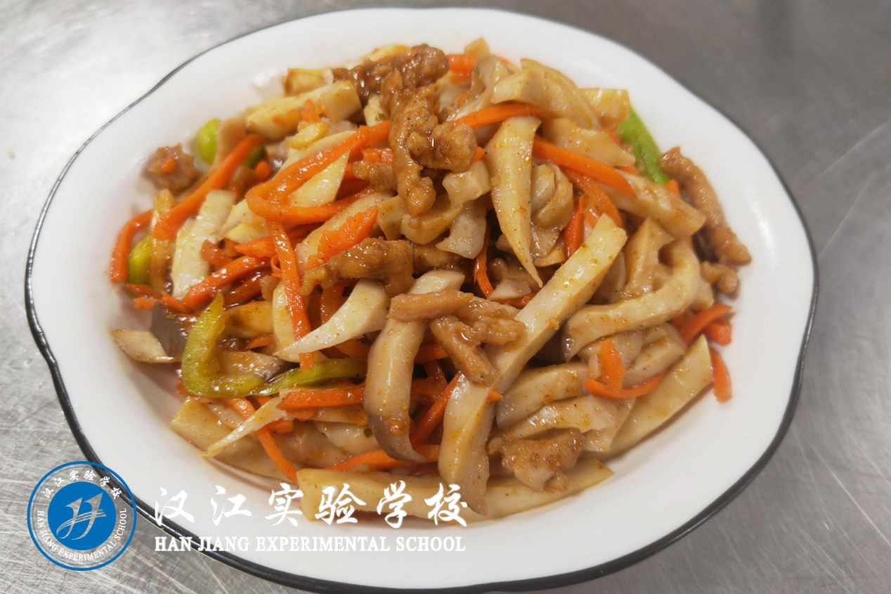 晚餐:汉江特色炒细面、雪花鸡柳(4—6年级)、红糖发糕(1—3年级)、炝包菜丝、莴笋炒肉片、绿豆汤