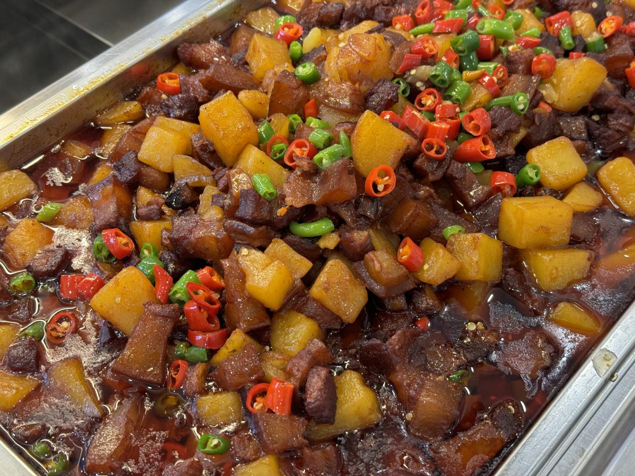 中餐:土豆炖牛腩、青椒香干回锅肉、白灼生菜、麻辣豆腐、山药鸡汤、米饭