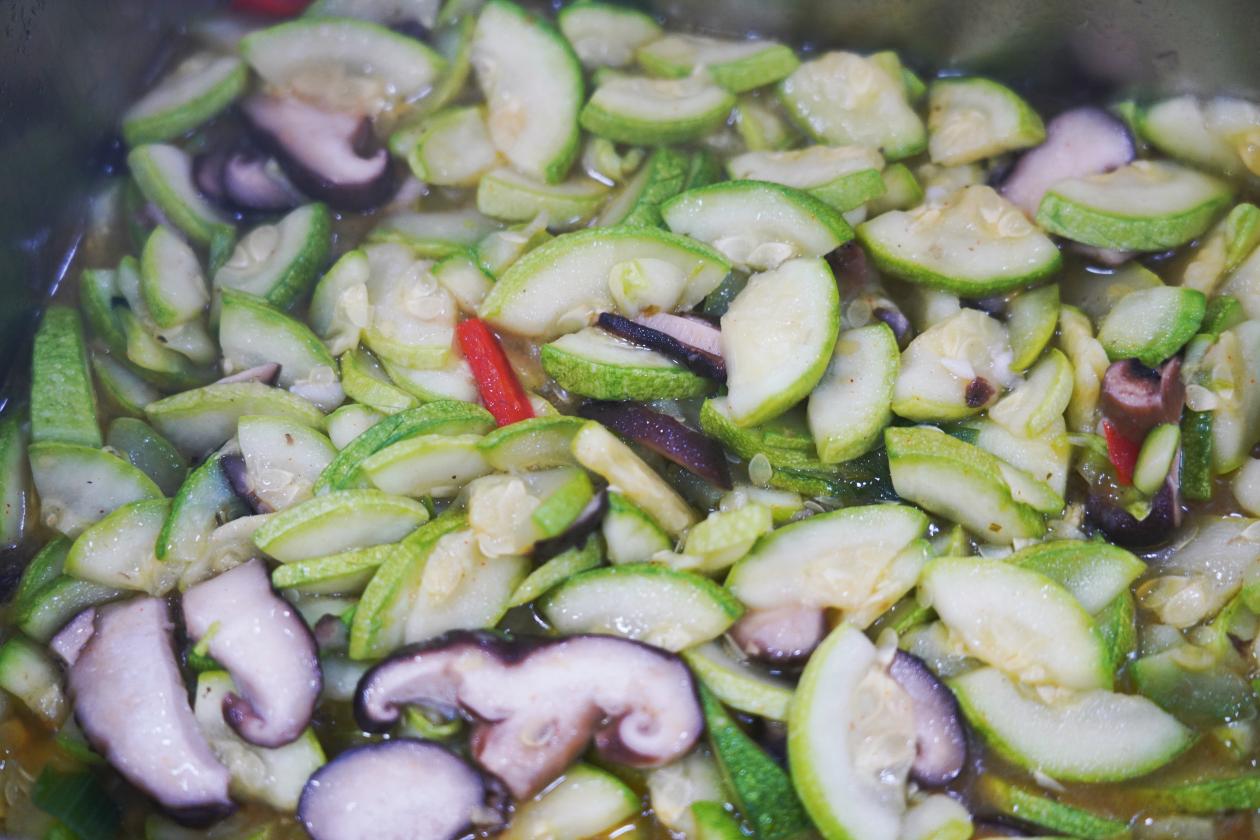 晚餐:香菇肉丝面、丝瓜炒鸡蛋、耗油生菜、发糕