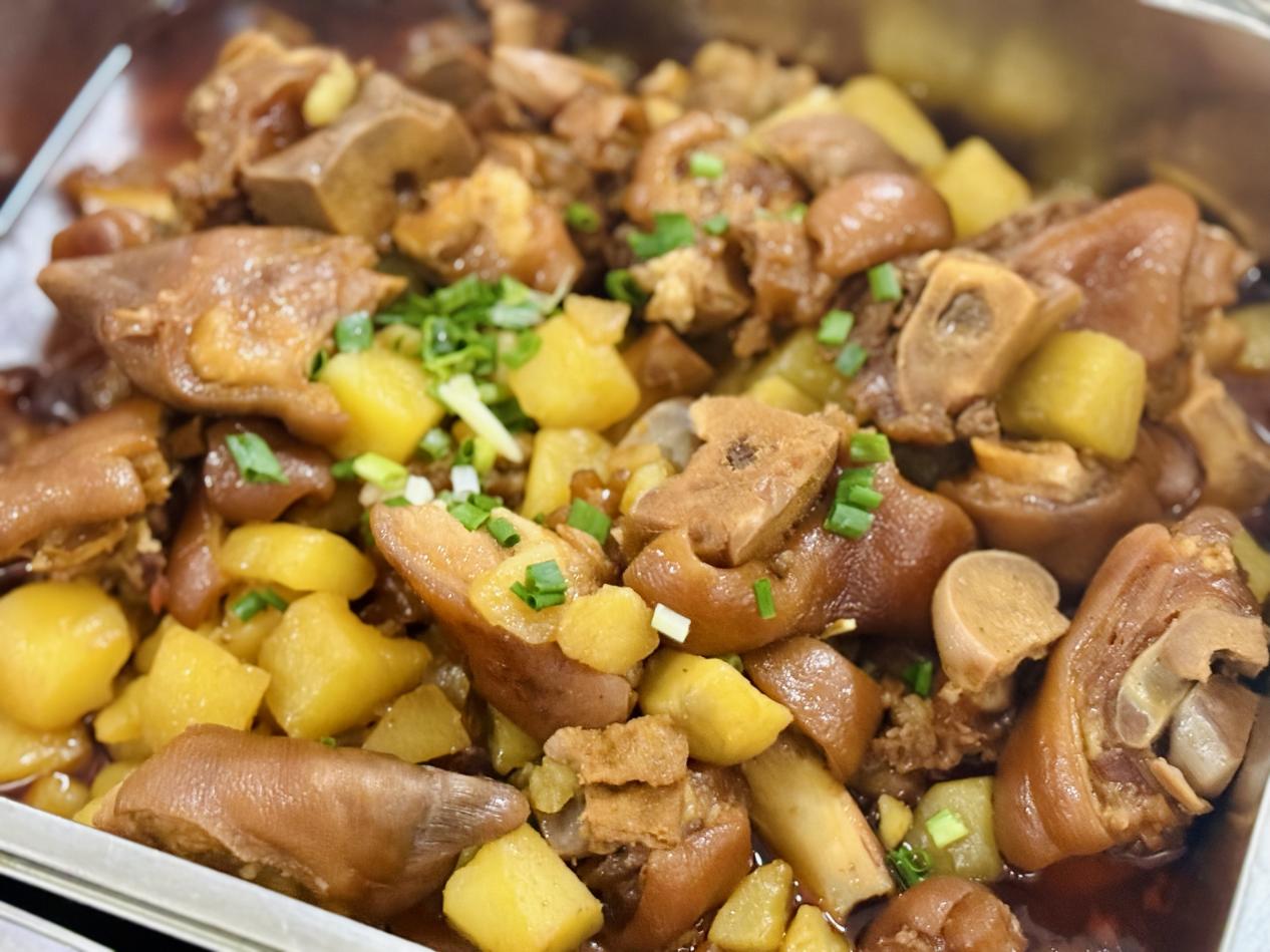 中餐:土豆烧猪蹄、豇豆肉丝、蒜蓉油麦菜、麻婆豆腐、虫草花炖鸡汤、米饭