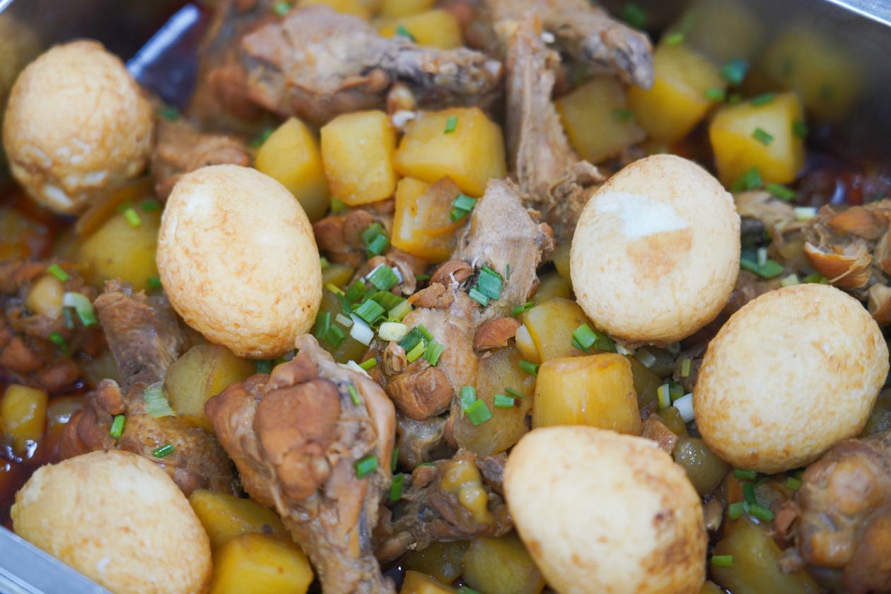 中餐:土豆炖猪手、宫爆鸡丁、香菇奶白菜、小青瓜炒蛋、米饭、海带鸭汤