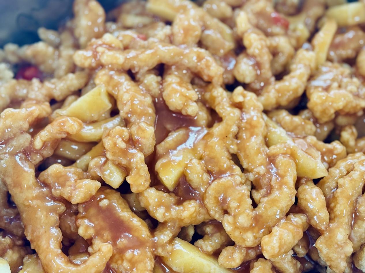 中餐:糖醋里脊、西蓝花肉片、蚂蚁上树、蒜蓉油麦菜、米饭、虫草花炖鸡汤