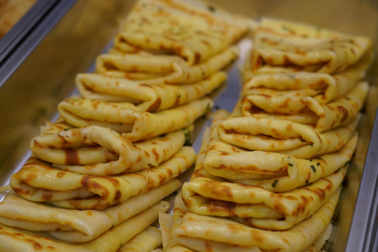 早餐:香菇肉丝面、鸡蛋饼、卤千张结、上汤娃娃菜、蒸粗粮