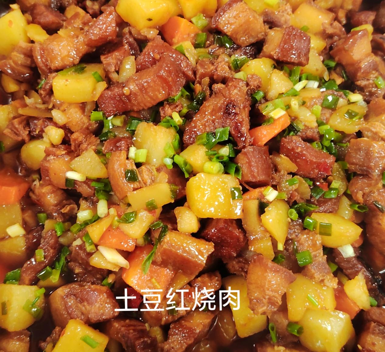 中餐:土豆烧牛腩、孜然肉片、蒸鸡蛋糕、木耳小青菜、萝卜鱼糕汤、米饭