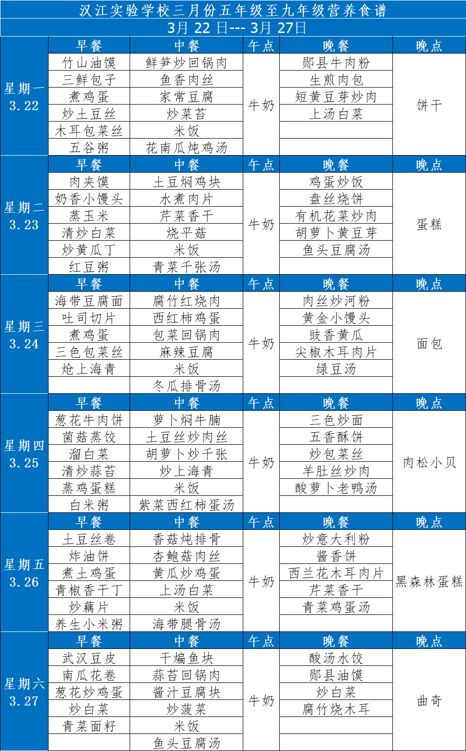 汉江实验学校2021年3月22日-2021年3月27日学生食谱公示: