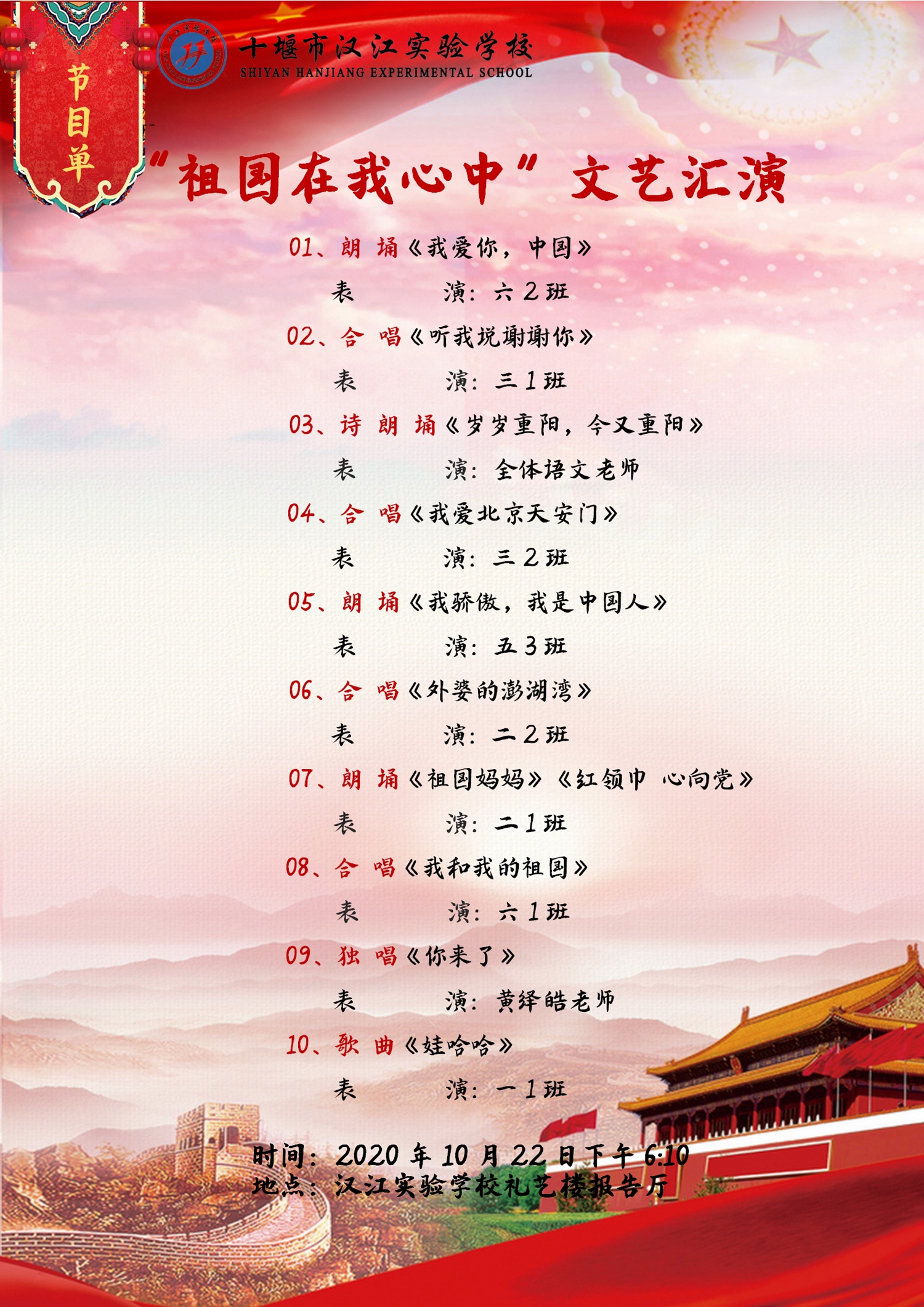 2020年10月22日,汉江实验学校小学在报告厅举行了“祖国在我心中”文艺汇演。副校长陈磊、陈伟、张旭东等领导,部分家长代表及部分老师观看演出。