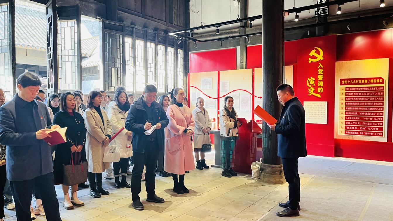 在政治生活馆,全体党员面向党旗作庄严宣誓“我志愿加入中国共产党,拥护党的纲领,遵守党的章程……”。