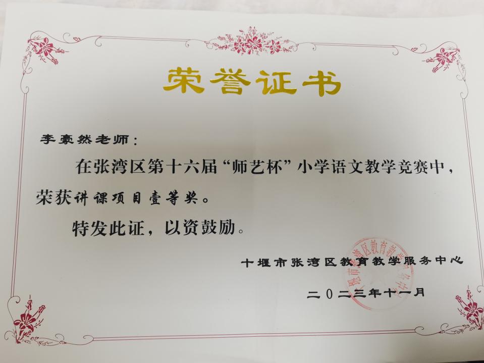 教育是一门科学,教育也是一门艺术,为了把课上出特色,李老师不遗余力,认真钻研教材,把握重难点,精心设计教学情境和教学环节,不断磨炼自己的师艺。在今年的张湾区第十六届“师艺杯”小学语文教学竞赛中荣获讲课项目一等奖。精彩的课堂教学呈现,过硬的教学质量,让她赢得了学生的喜爱和家长的认可。