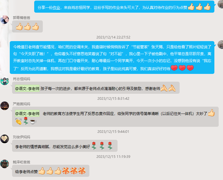 动人以言者,其感不深;动人以行者,其应必速。李老师深谙此道,她深耕课堂,全情投入教学中,精心雕琢自己的每一节课。课上,她把获取知识的主动权交给学生,让学生成为信息的主动摄取者和加工者,充分发掘学生自己的潜能,使学生从被动接受的“要我学”转化为主动的“我要学”;课后,她认真仔细批改作业,激发学生学习热情。凭借过硬的教学基本功,她所教的班级成绩一直名列前茅。
