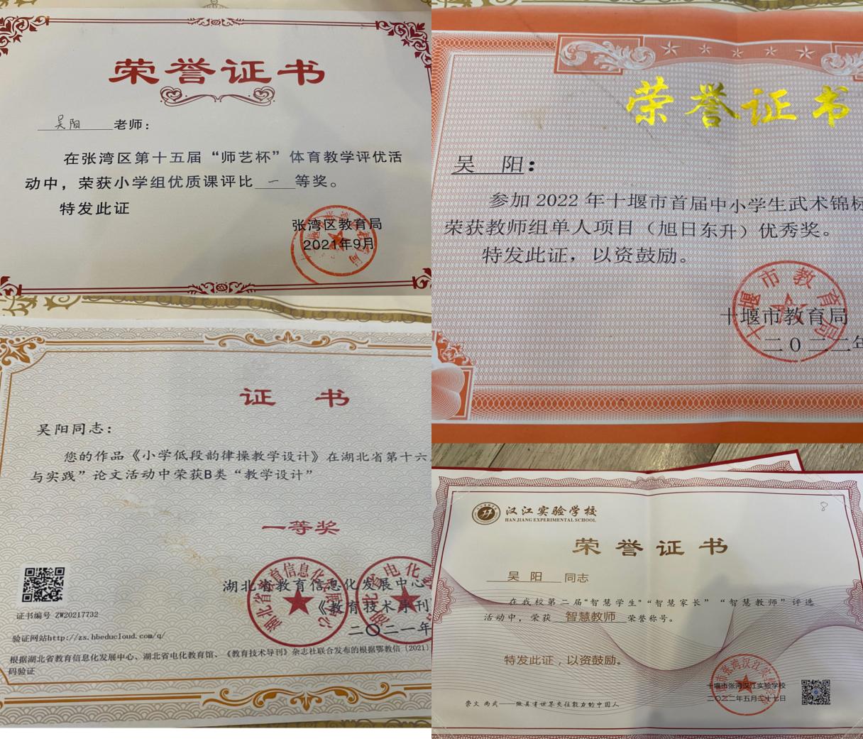 吴阳,汉江实验学校小学部体育教师,曾在湖北省“技术理论与实践 ”论文活动中多次荣获一等奖,十堰市阳光大课间活动优秀指导教师,十堰市武术锦标赛优秀教师,区级体育师艺杯赛课活动一等奖,及校级“优秀教师 ”等称号。