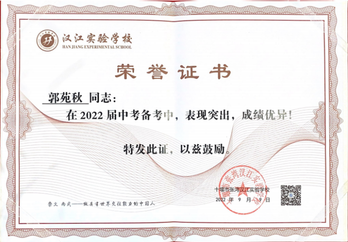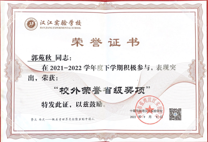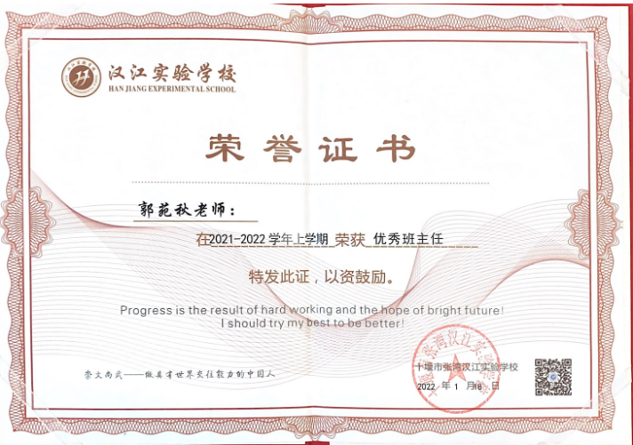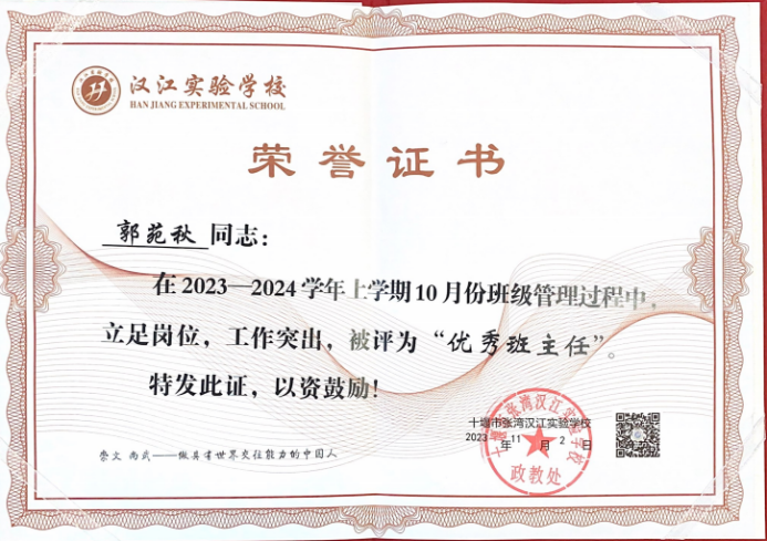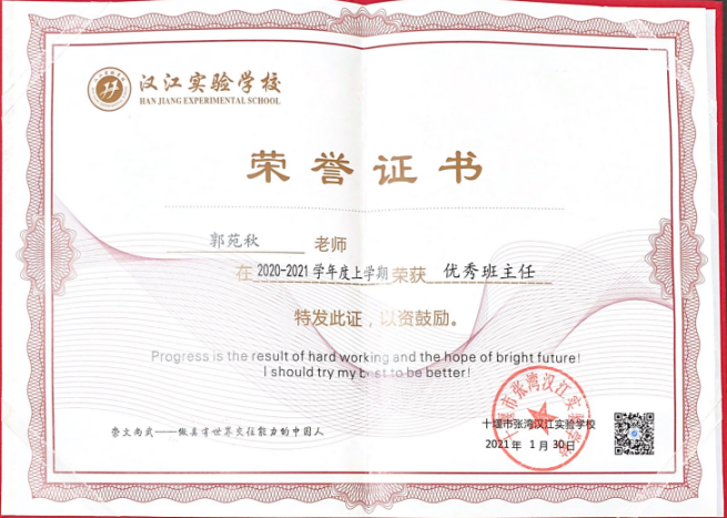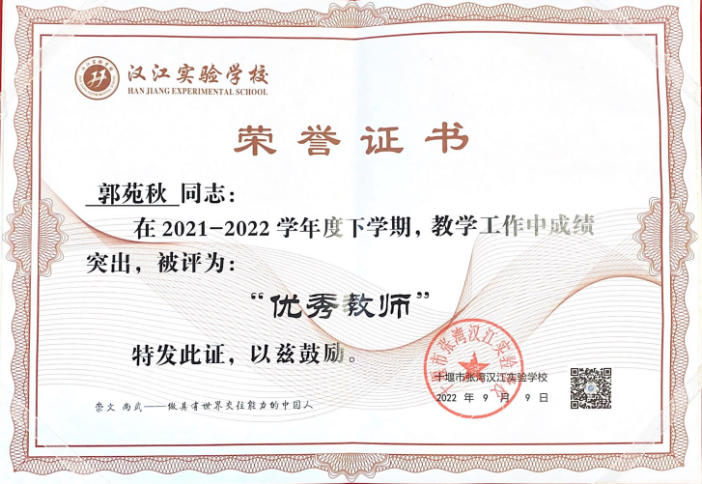 郭苑秋,汉江实验学校八年级英语教师、八(9)班班主任、八年级英语备课组长。从教至今,连续从事班主任及英语教学工作。先后获得“优秀班主任”、“优秀教师”、“辛勤耕耘奖”、“中考优胜奖”、“月度明星教师”、“全国家庭教育主题活动优秀班级组织奖”、“全国家庭教育主题活动优秀指导教师奖”等荣誉称号,所带班级也多次被评为“优秀班集体”。