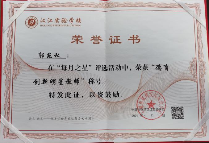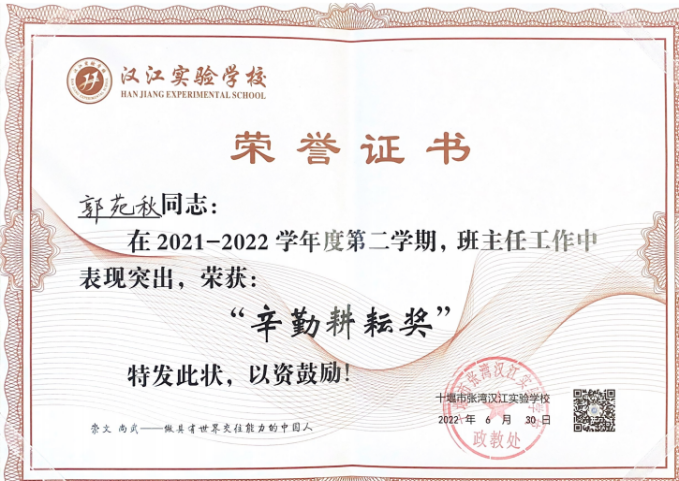 黑发积霜织日月,粉笔无言写春秋。一间教室,播撒爱心,放飞希望;三尺讲台,点燃梦想,绽放光芒。这是郭苑秋老师从教以来一直秉承的初心,她在工作岗位上诠释着为人师者的责任与担当,展现了汉实教师的精神风貌。自踏上讲台开始,她以勤勉扎实的工作作风,赢得了学生、家长和社会的赞赏与支持。她的事迹没有轰轰烈烈,没有惊天动地,而是默默无闻,扎根讲台,铸就不朽师魂。