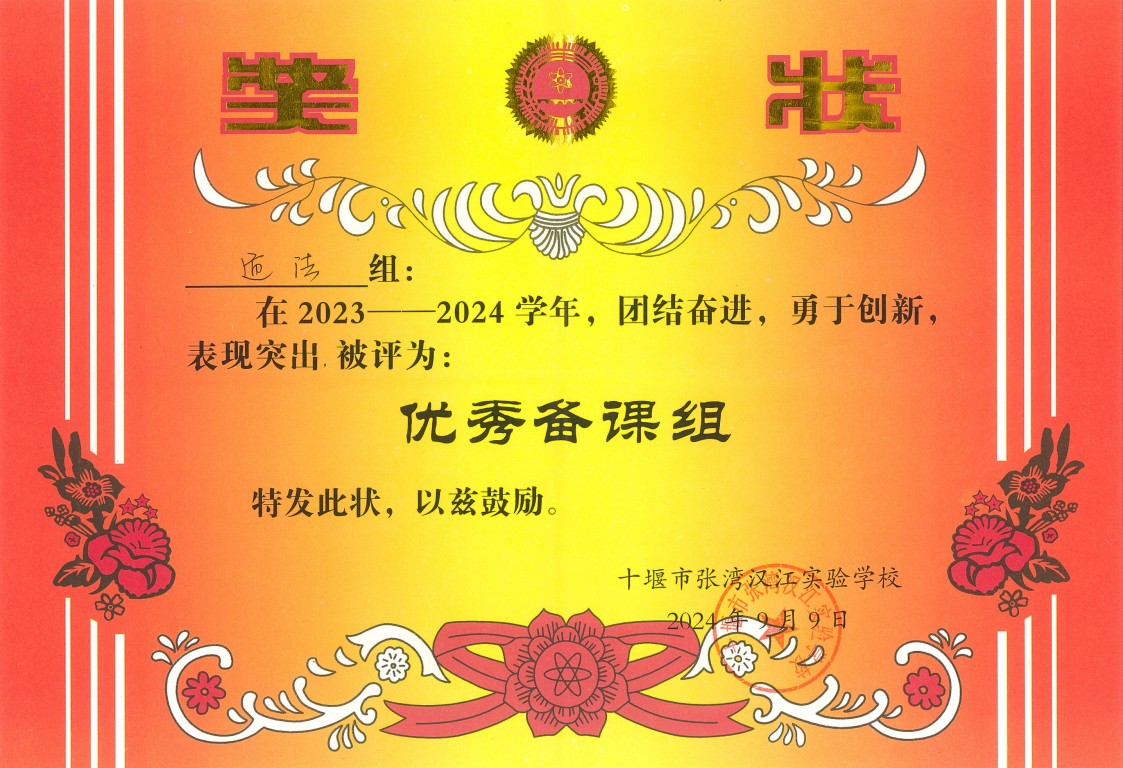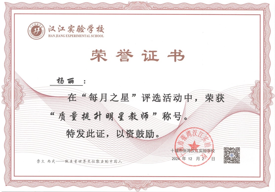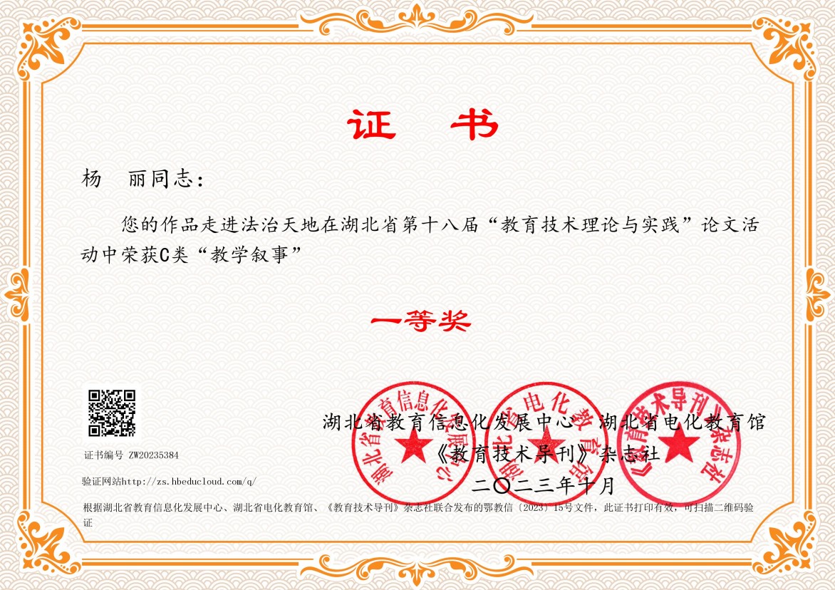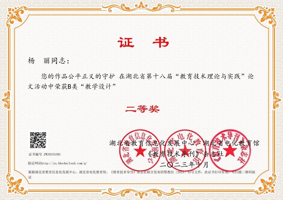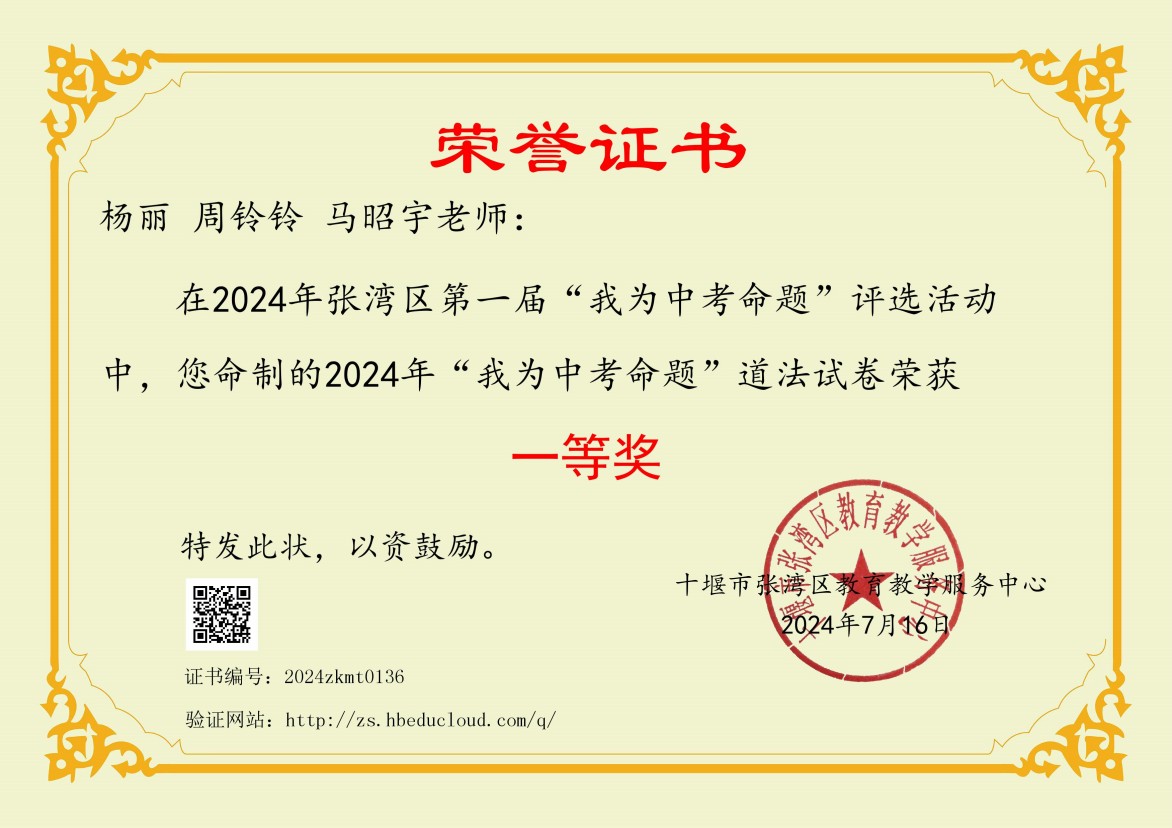 深耕硕果,载誉前行。杨丽老师撰写的论文《走进法治天地》《公平正义的守护》荣获湖北省一、二等奖;在2024年张湾区第一届“我为中考命题”评选活动中,她与同组老师共同命制的道法试卷荣获一等奖。