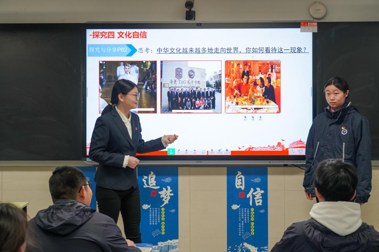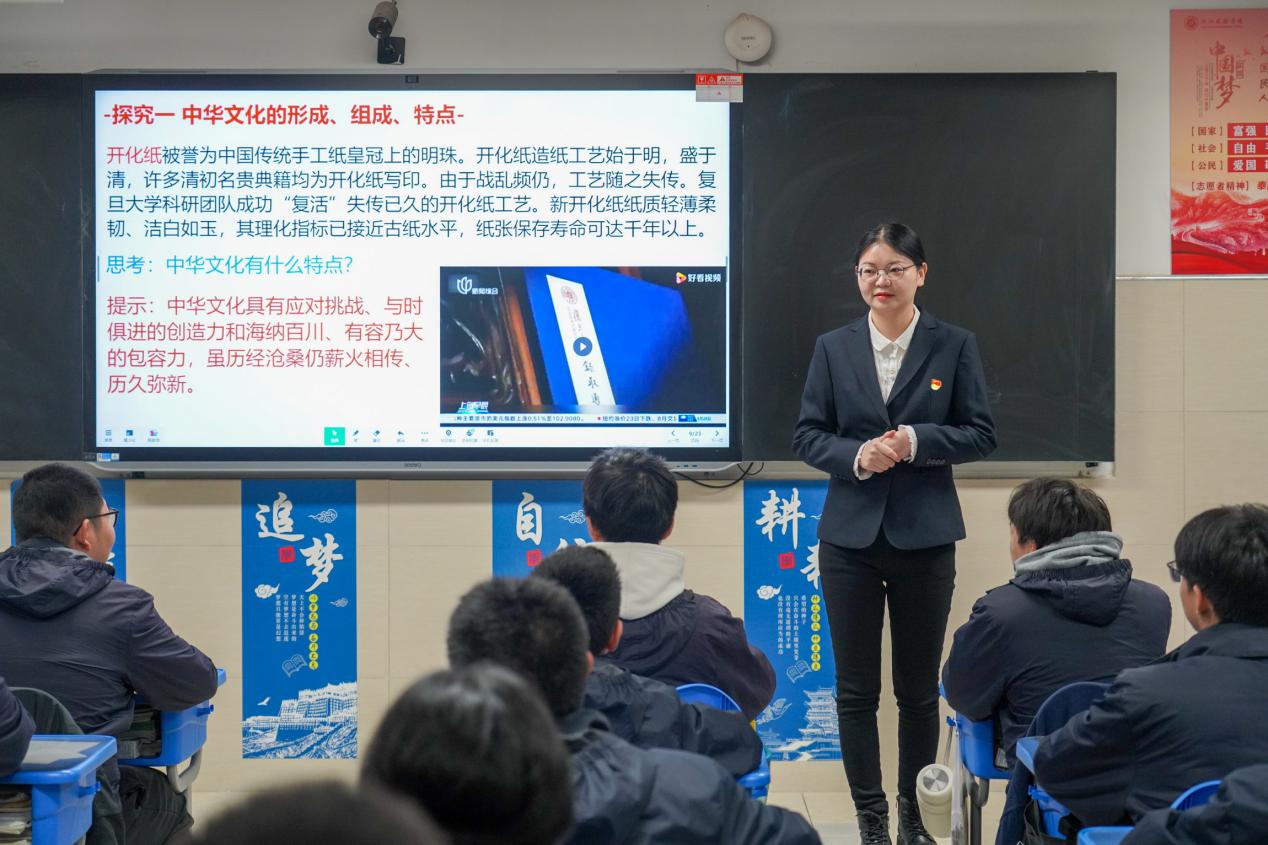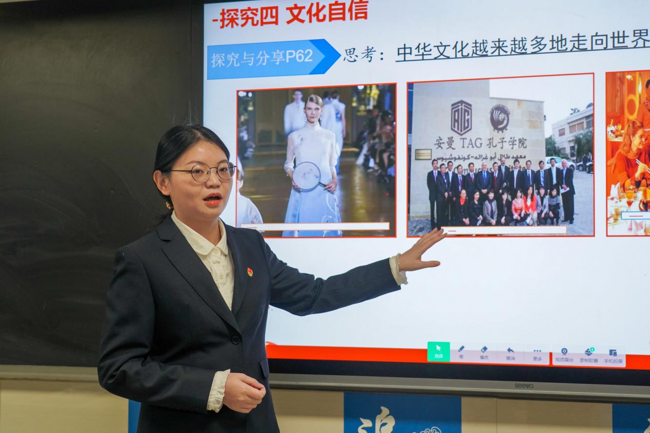 杨老师积极组织课堂活动和成果展示,把教材内容汇总分类,让学生以视频拍摄、文字创作、手工制作、情景剧表演等形式,展示优秀传统文化教育、道德教育、革命传统教育、法治教育、时政教育等主题教育成果,培养学生与时俱进的公民意识和家国情怀,引导学生深度思考,提高自我的思辨力,树立正确的世界观、人生观、价值观。