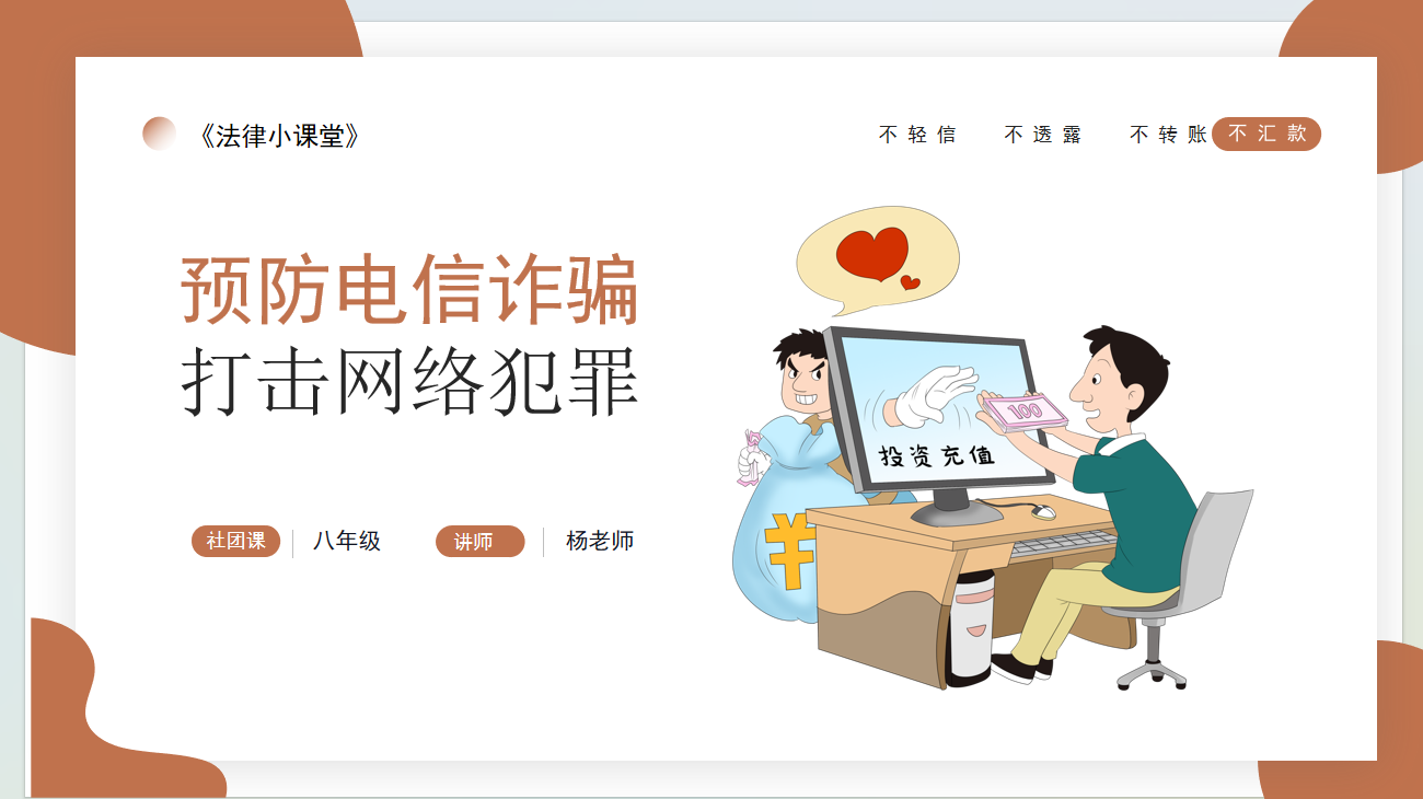 课堂之外,杨老师利用社团课为学生开设法律小课堂,每次围绕一个主题内容进行法律基础知识讲解、品德素质教育,紧密结合生活时事,指引学生正确面对陷阱,增强自我保护意识,规范自身言行。