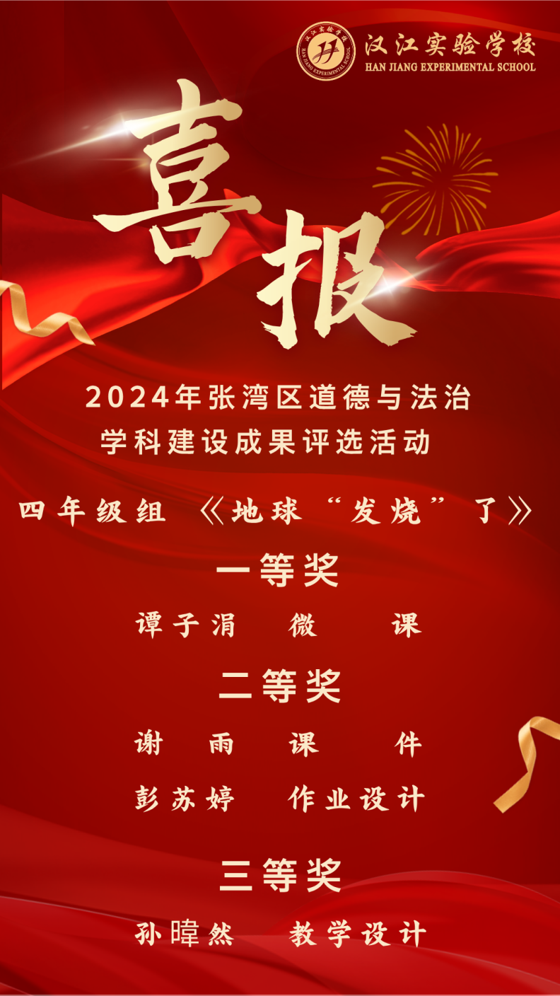 在2024年张湾区道德与法治学科建设成果评选活动中,汉江实验学校道德与法治学科组四名教师分获一、二、三等奖。