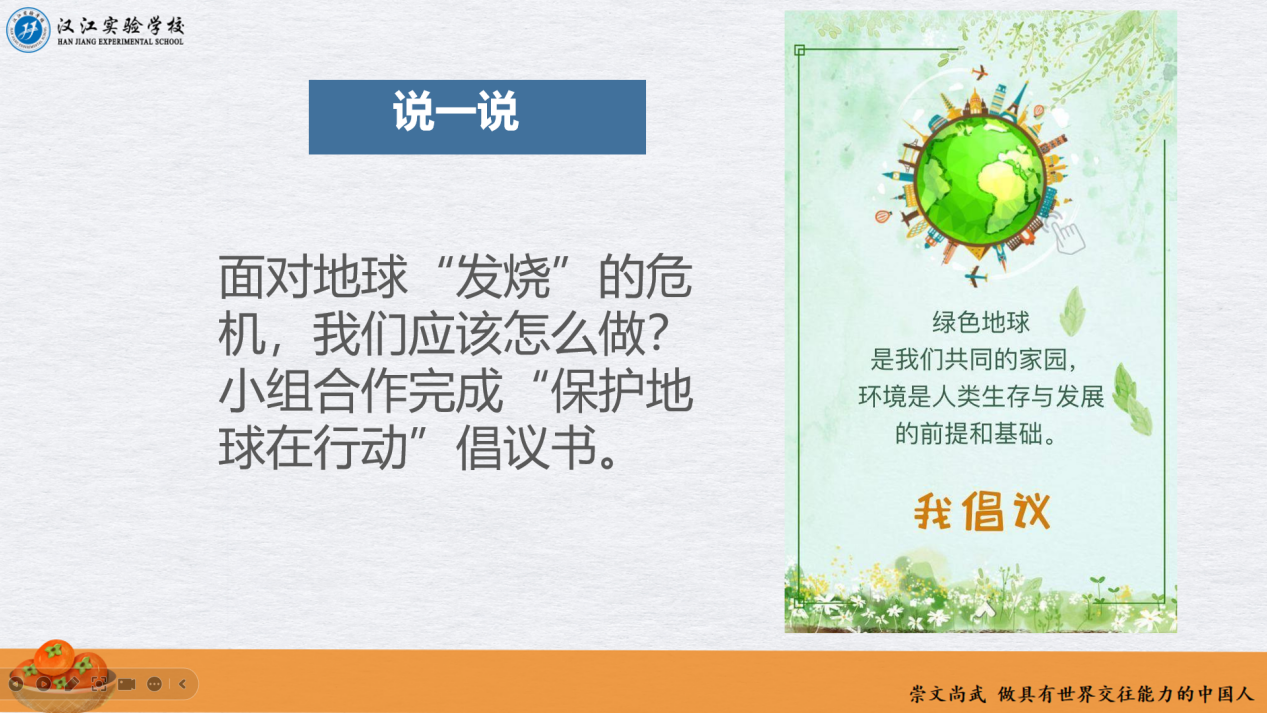 课程最后以“保护地球我倡议”的环节深化本节课主题,培养学生的环保意识。