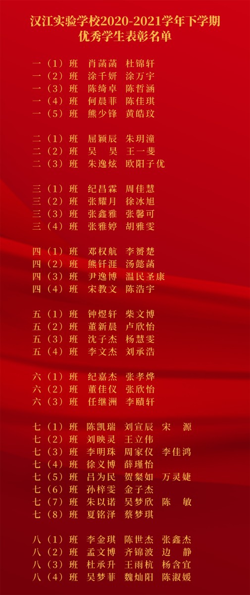 下一篇:?汉江实验学校2020-2021学年下学期“先进班集体”表彰名单