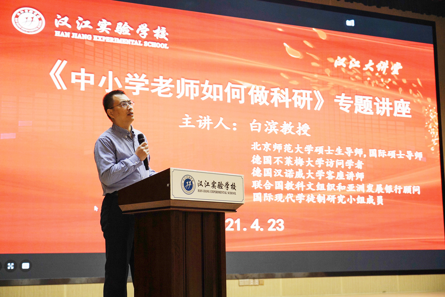 2021年4月23日,《北京师范大学—汉江实验学校教学质量提升项目》专家、北京师范大学教育学部职业与成人教育研究所硕士生导师、国际硕士导师白滨教授,应邀在我校举行题为《中小学老师如何做科研》的讲座。汉江实验学校校长朱仕竹,副校长陈磊、王宇、张旭东出席报告会,全体教职工参与培训。