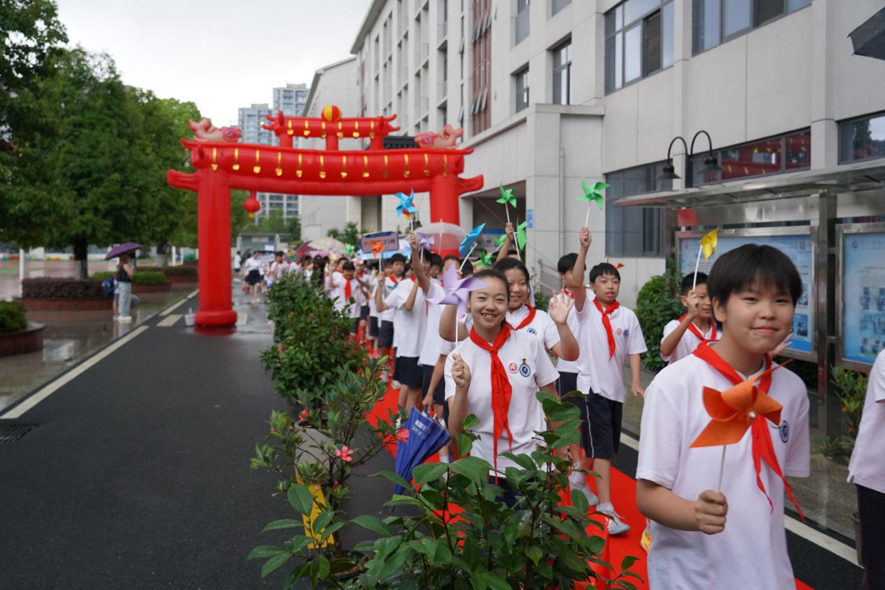 六年级全体师生共同踏上红毯,越过启航门,相聚报告厅,一起开启汉江实验学校2024年六年级学生毕业典礼。