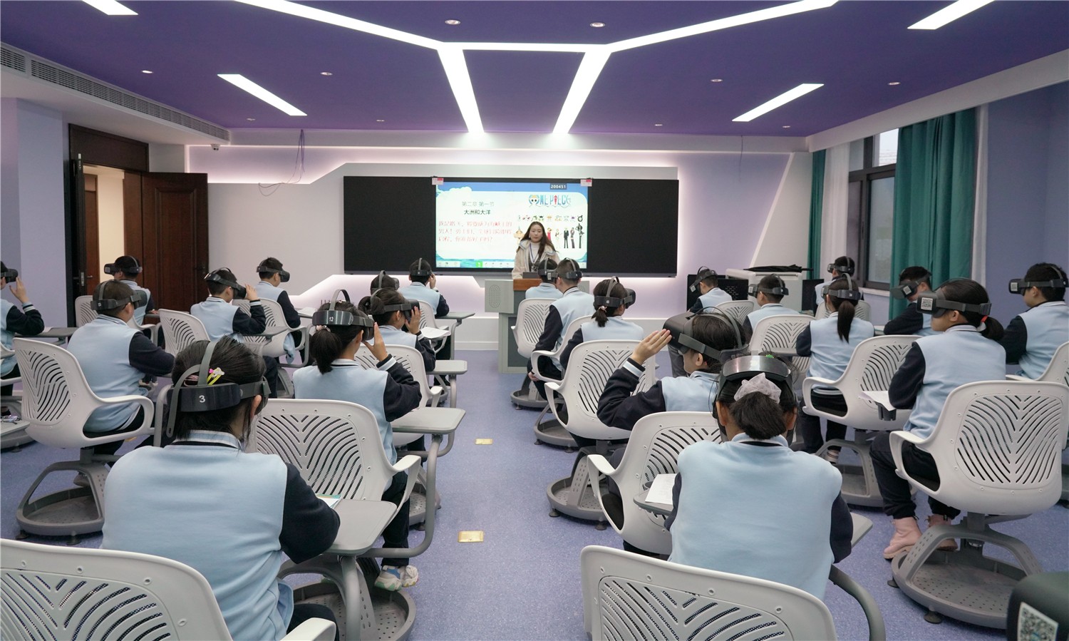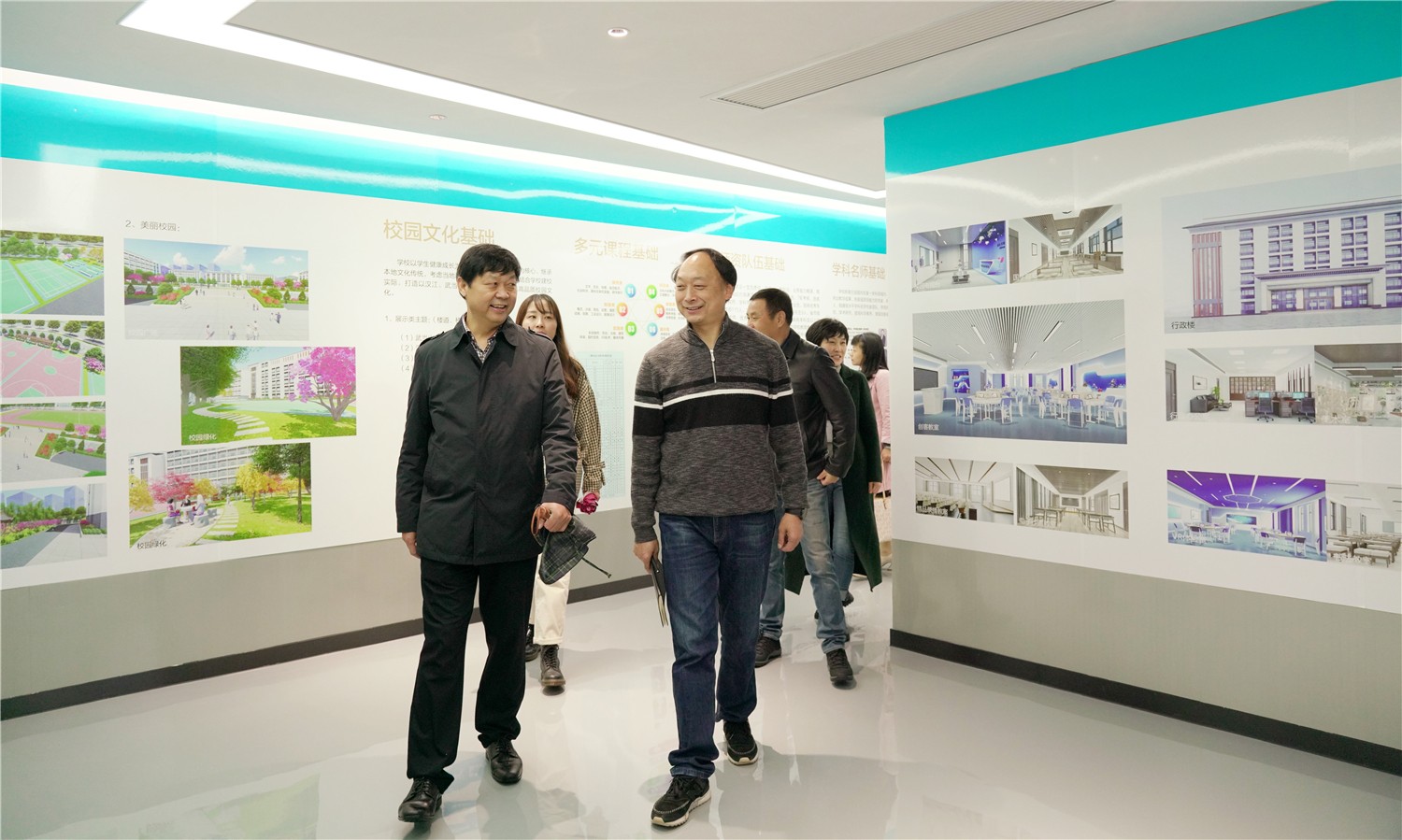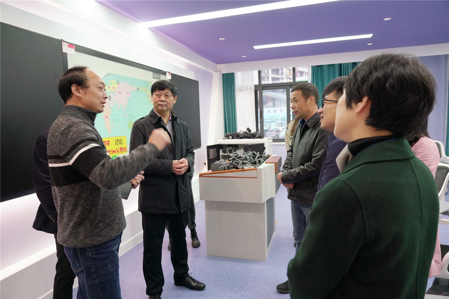 周主任一行参观了教学楼及校园文化展示厅、未来教室、电子书法室、电子沙画室、VR虚拟体验室等功能室,在未来教室观摩了我校一年级胡靖雯老师的智慧课堂,在教学楼观看了八年级周兵老师的数学课。周主任对我校的现代化智慧校园建设高度评价,对老师和孩子们在课堂上娴熟使用现代化教学设备开展教学表示赞赏。