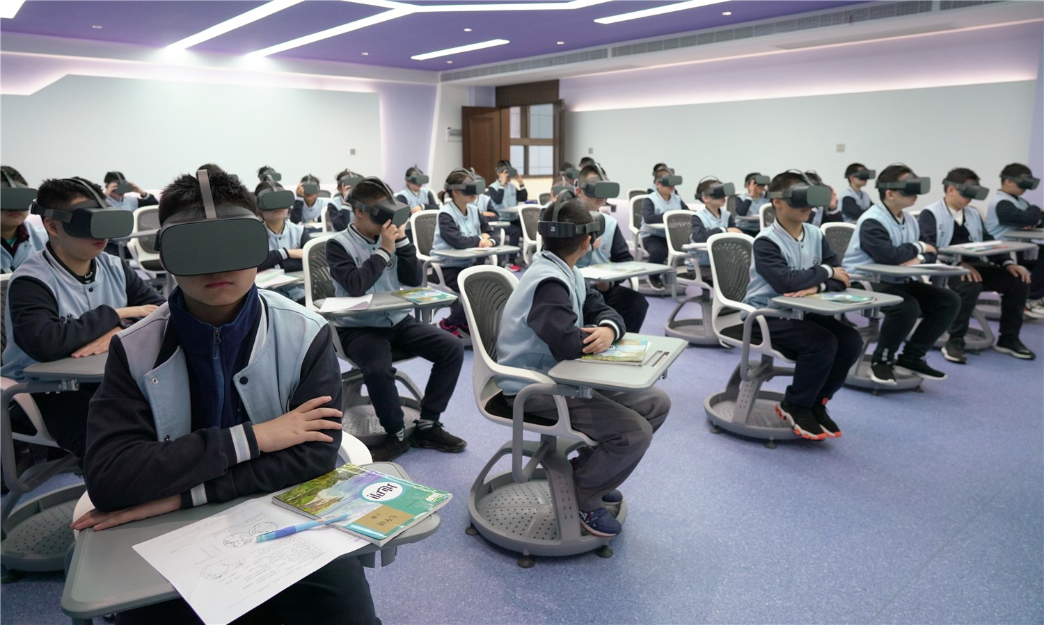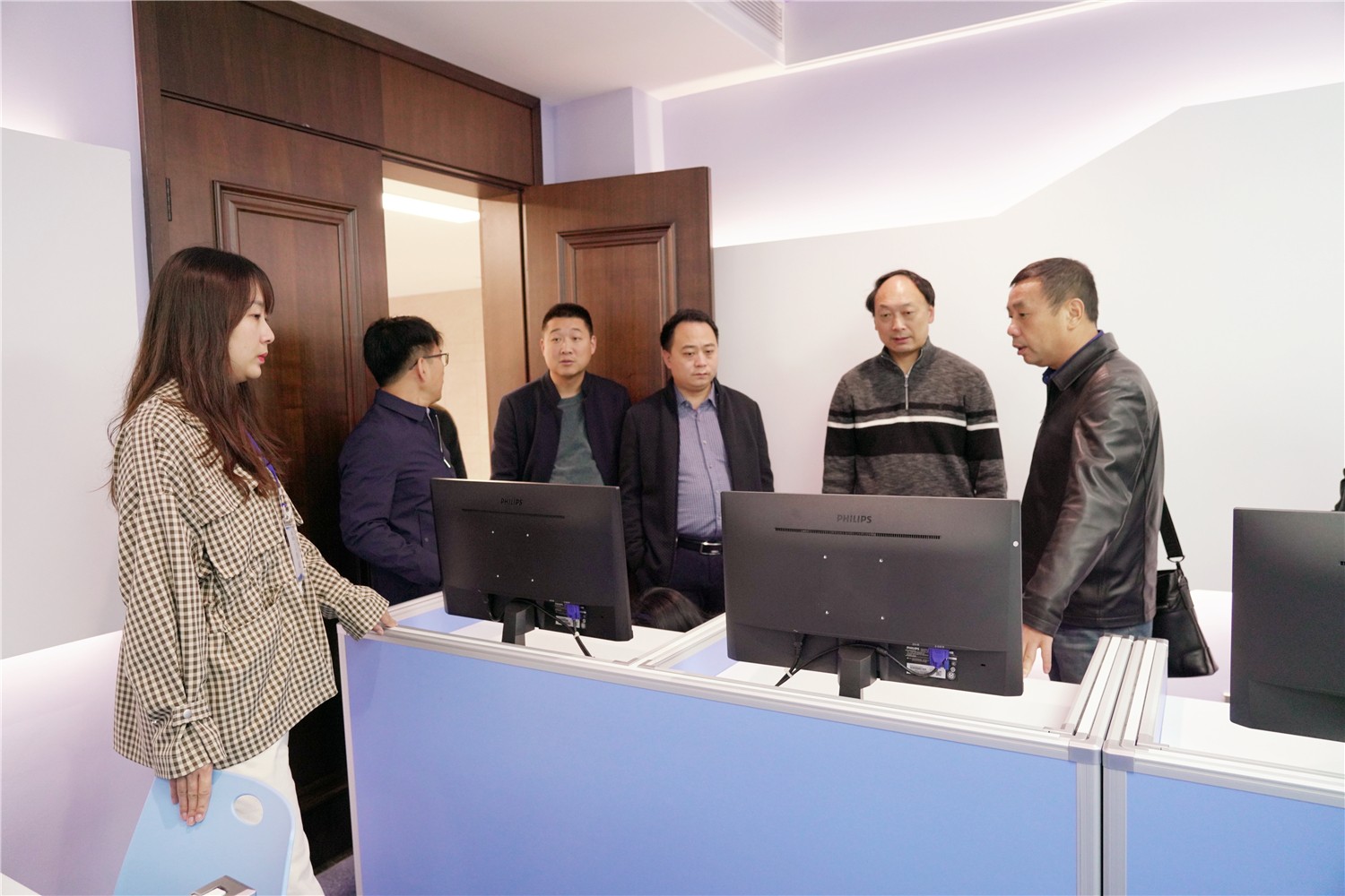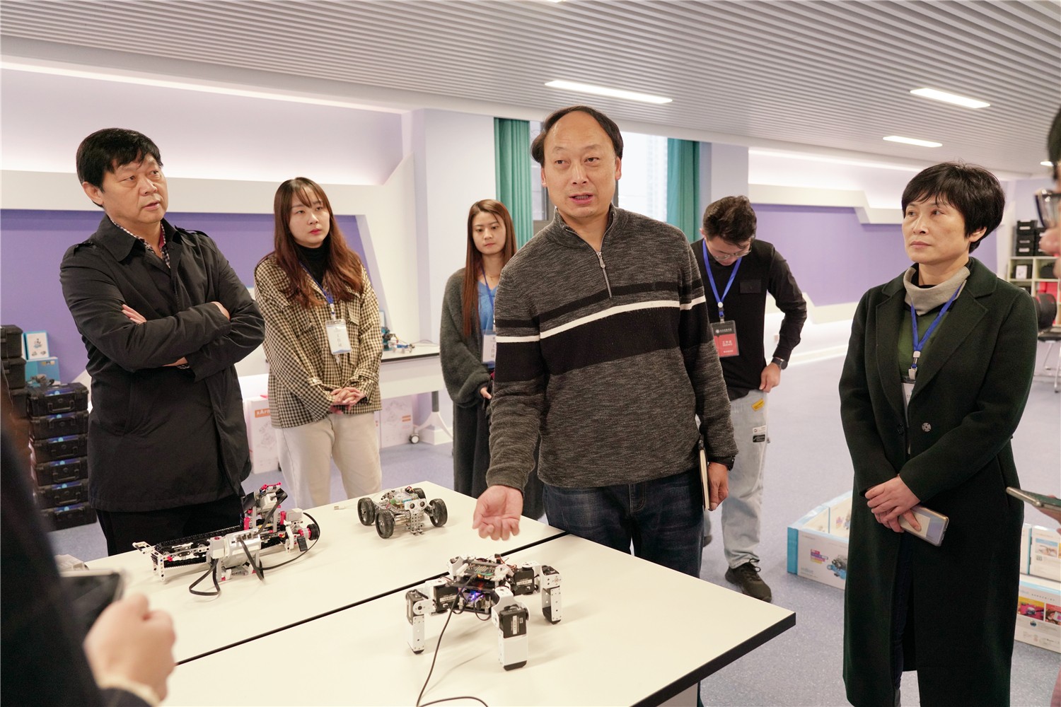 周主任一行参观了教学楼及校园文化展示厅、未来教室、电子书法室、电子沙画室、VR虚拟体验室等功能室,在未来教室观摩了我校一年级胡靖雯老师的智慧课堂,在教学楼观看了八年级周兵老师的数学课。周主任对我校的现代化智慧校园建设高度评价,对老师和孩子们在课堂上娴熟使用现代化教学设备开展教学表示赞赏。