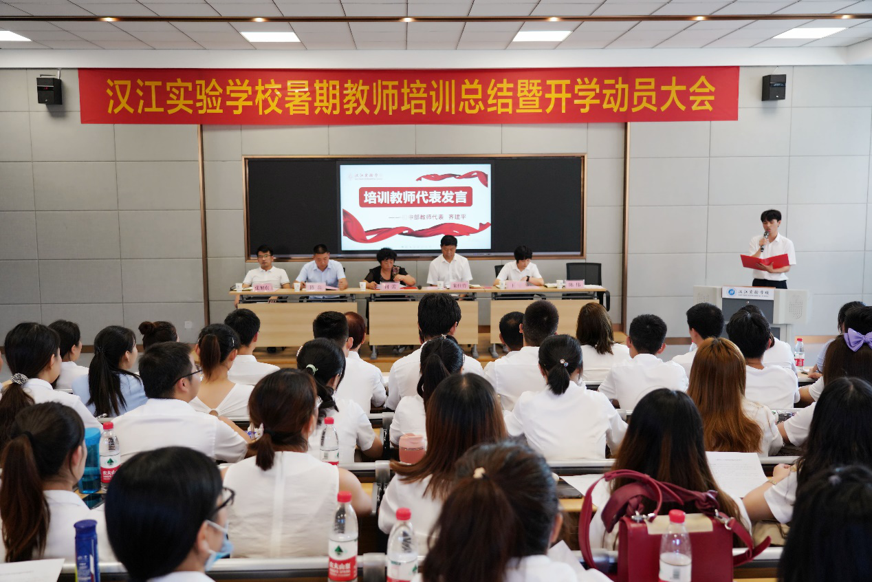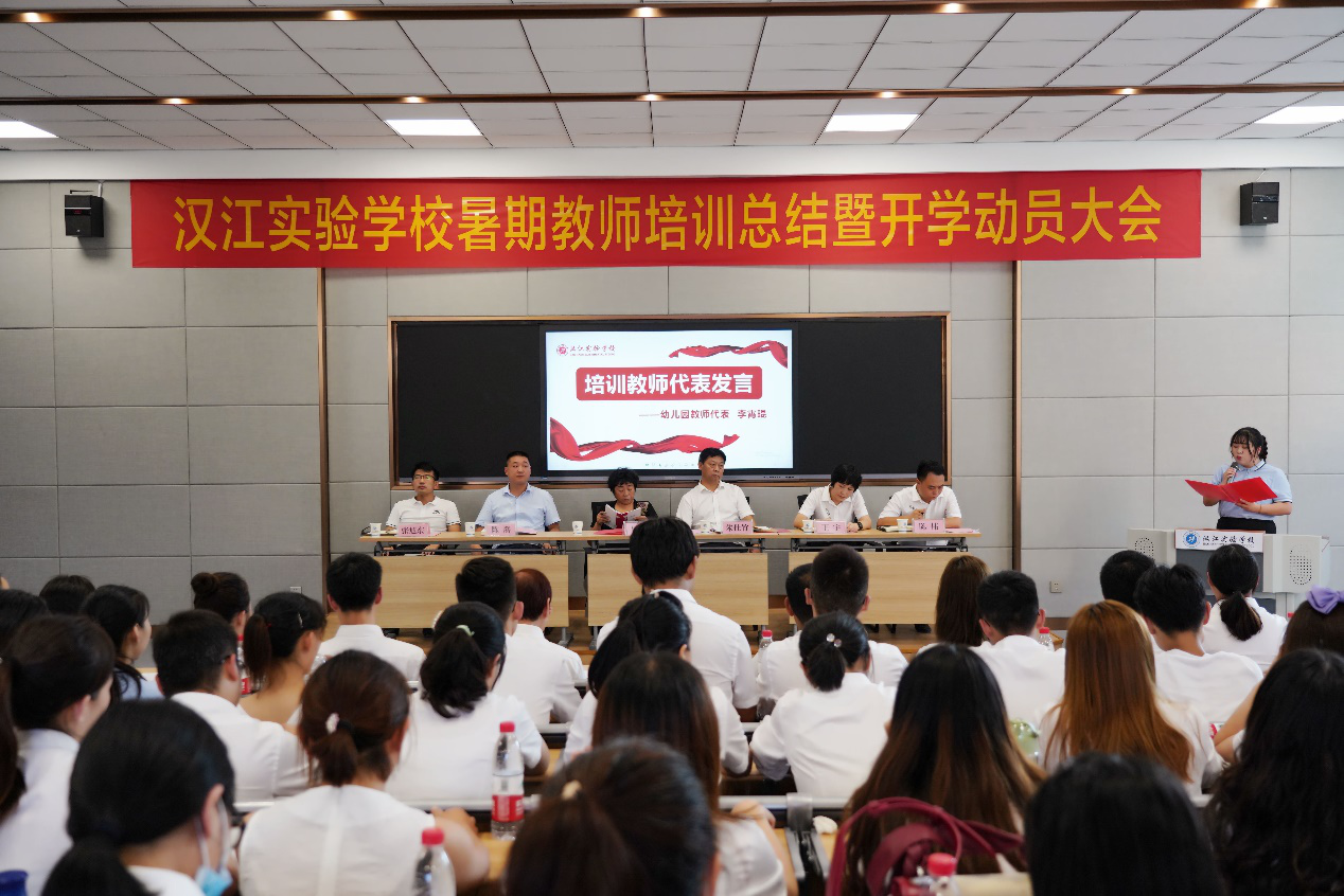 初中教师齐建平、小学教师童玲、幼儿园教师李霄琨作为教师代表分别作了《学无止境,大爱无疆》、《我骄傲,我是汉江实验人》、《以匠心,致初心》的发言,他们从师德师风、家校沟通、个人成长、学校发展等方面畅谈了自己的工作感悟和教育心得,真挚的情感获得了全场教师员工的深深共鸣。