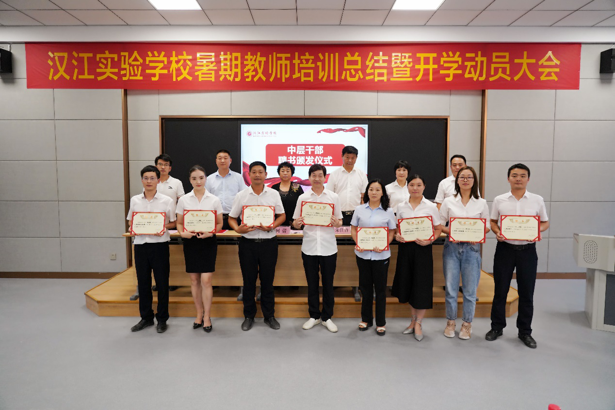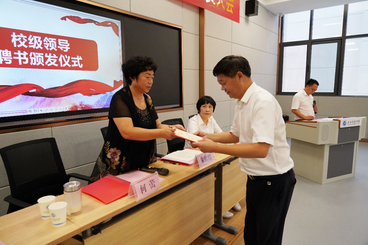 按照大会议程,分别宣读了朱仕竹校长、四位副校长及八位中层干部的任命,并颁发了聘书。