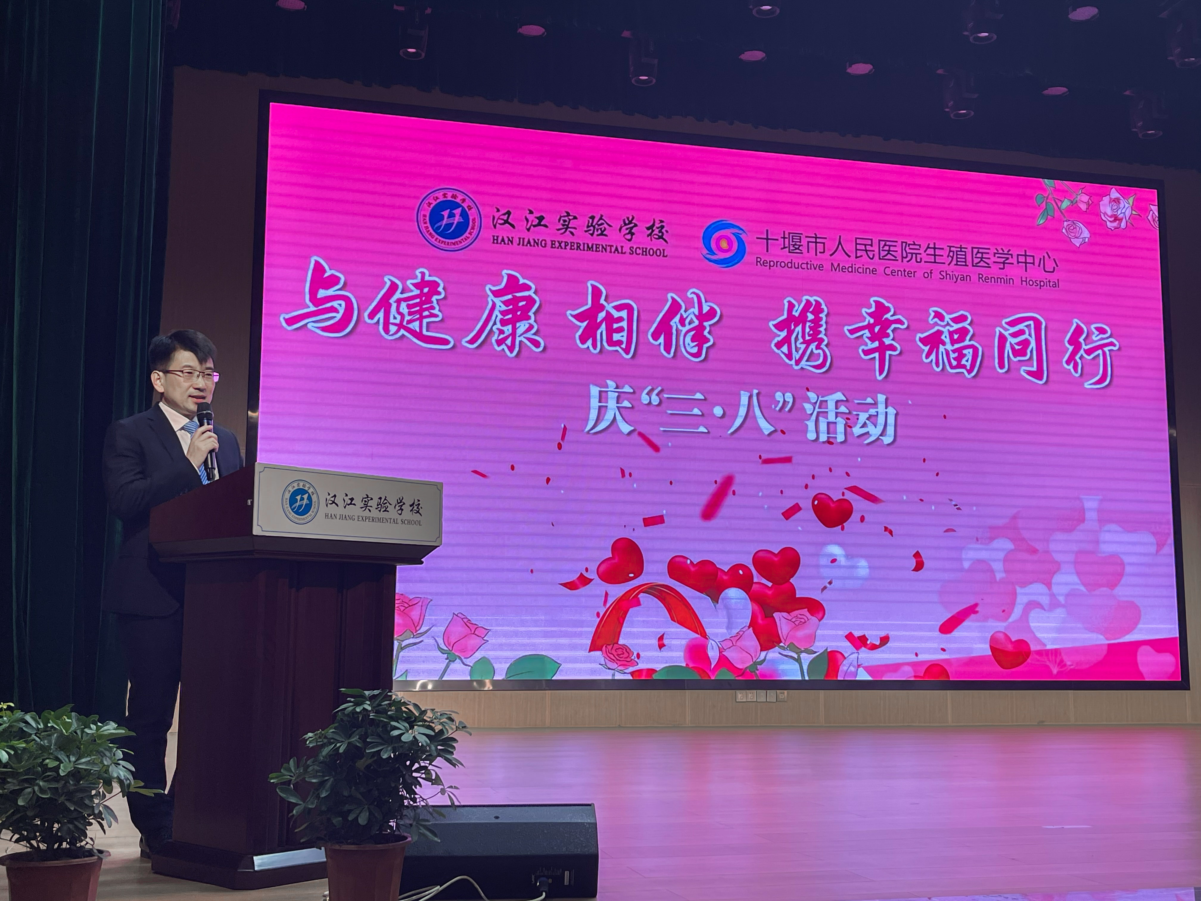 2021年3月8日,我校特邀十堰市人民医院生殖医学中心创始人张昌军教授在我校报告厅举办了“与健康相伴,携幸福同行——汉江实验学校庆三?八”健康讲座。十堰市人民医院生殖医学中心主任张颖博士、信息部部长胡冬玲、护士长陈娟;汉江实验学校董事长何蕾,校长朱仕竹,副校长王宇、陈伟、张旭东出席此次健康讲座,全体女教职工参加讲座。