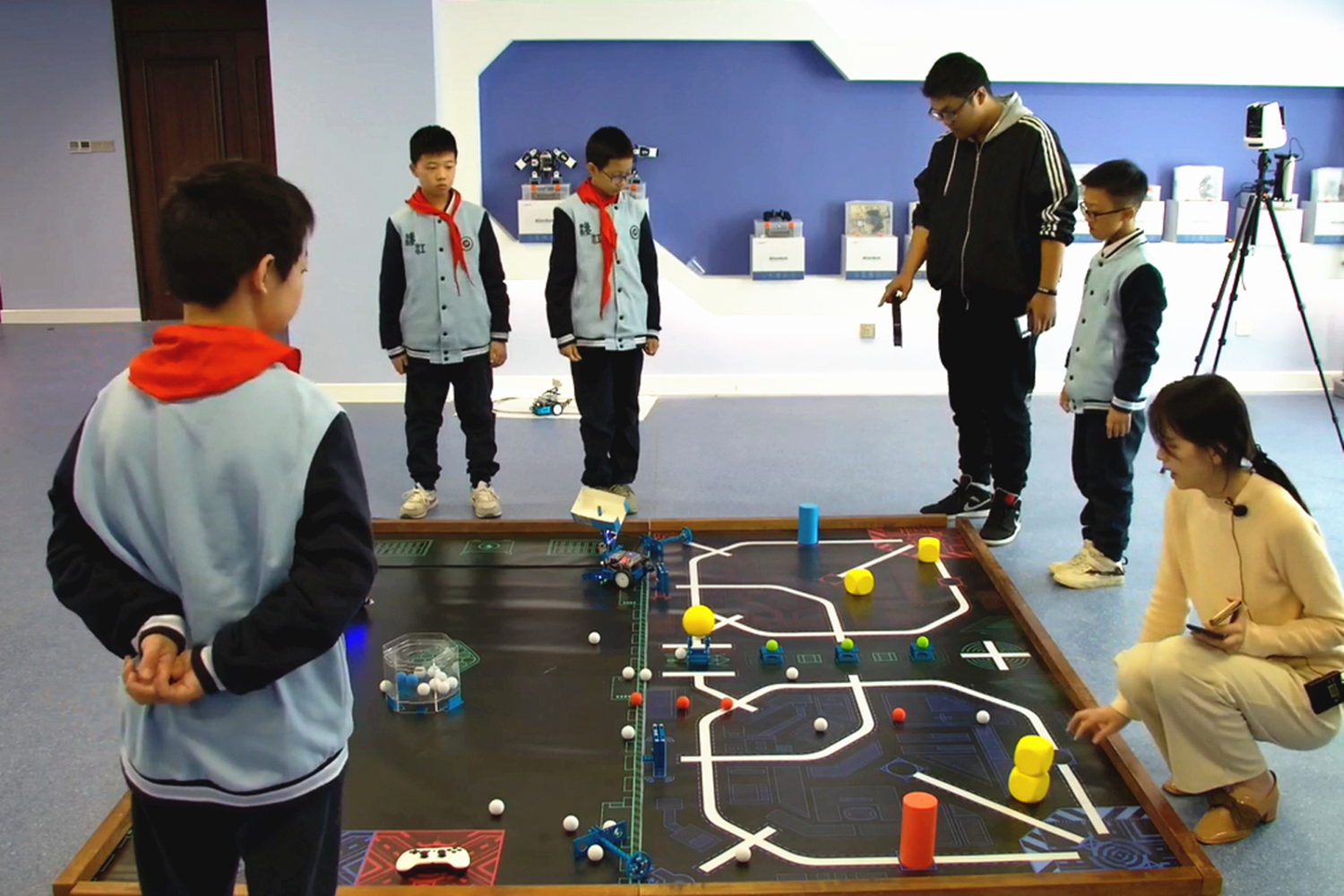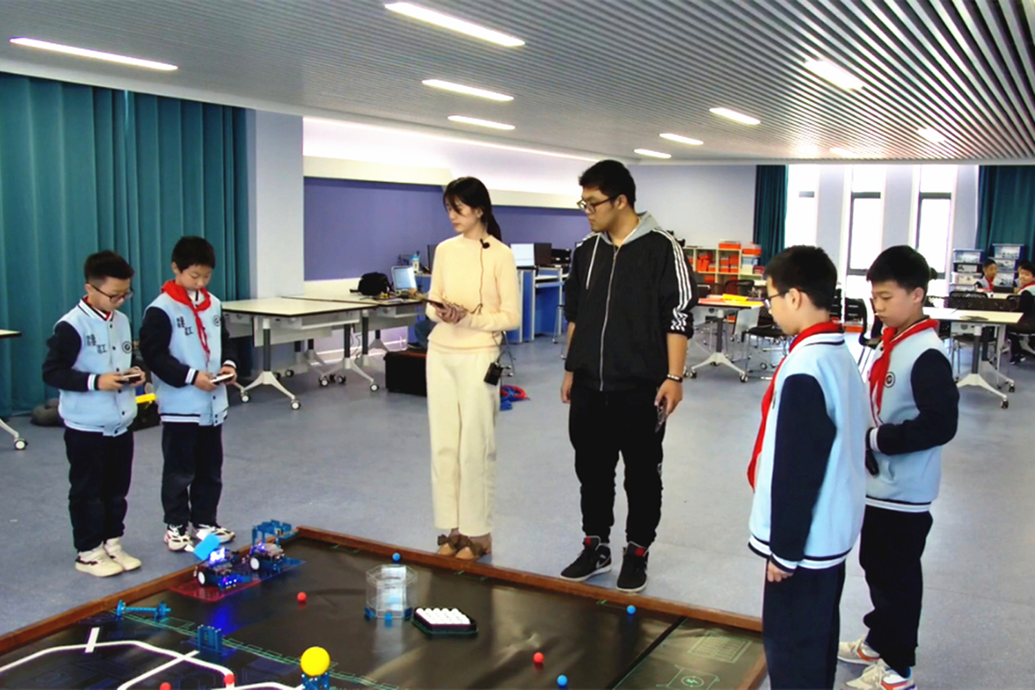 徐志翔、孔维泽、程雨泽、刘竣锡操控、演练MakeX智慧交通项目?