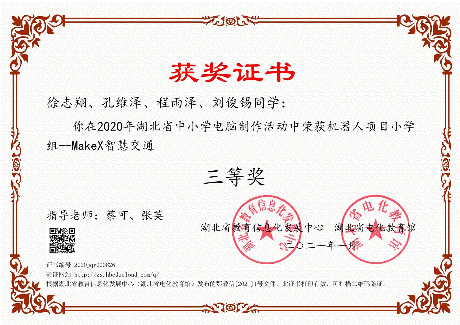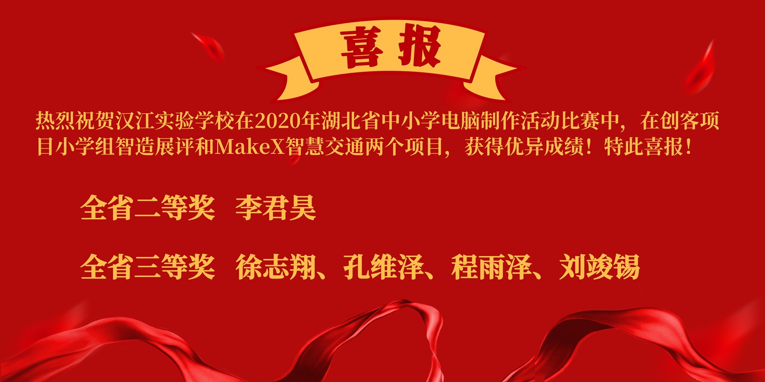 2020年湖北省中小学电脑制作线上展示交流活动竞赛结果近日揭晓。全省共有1072件作品参选比赛,我校学生在创客项目小学组智造展评和MakeX智慧交通这2个项目的角逐中,分别荣获省级二等奖、三等奖。