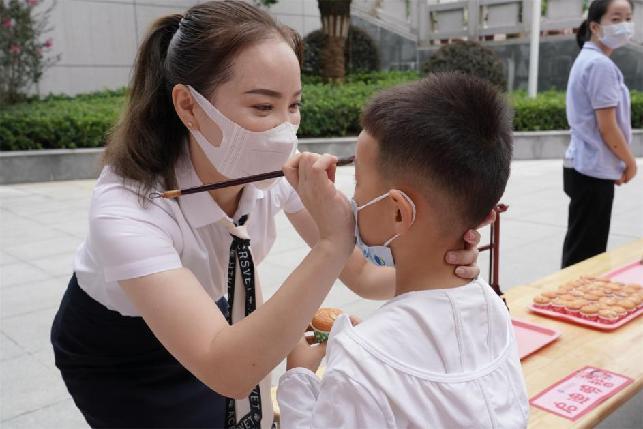 幼儿园准备了形式多样的互动环节,让幼儿摸摸葱,寓意聪明伶俐;吃一口糕点,寓意步步高升……为幼儿点朱砂,开启智慧;并为家长准备祈福许愿瓶,写上对孩子们的愿望和祝福。通过丰富的内容、趣味的互动,让幼儿充分感受幼儿园的浓厚园所文化,轻松学习,快乐成长。