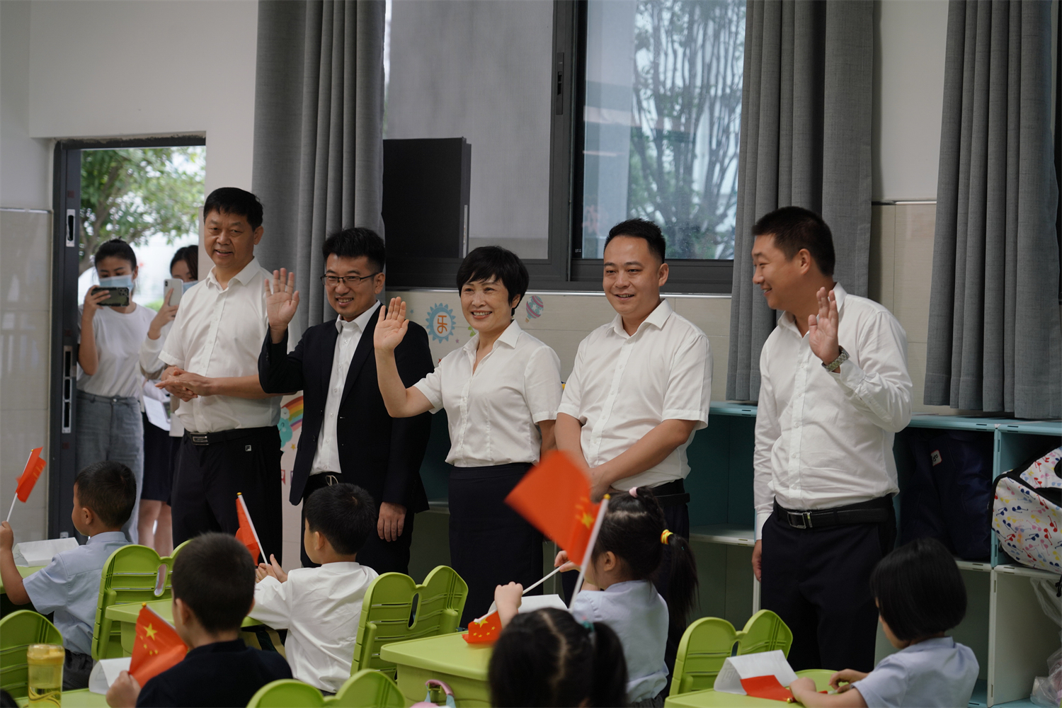 教室里,老师为同学们送上开学鲜花,引导同学们积极参与小游戏,让同学们在欢声笑语中扬帆新学期的航程。校长朱仕竹,副校长陈伟、陈磊、王宇、张旭东等领导也来到各班级,为孩子们送来温暖的问候。