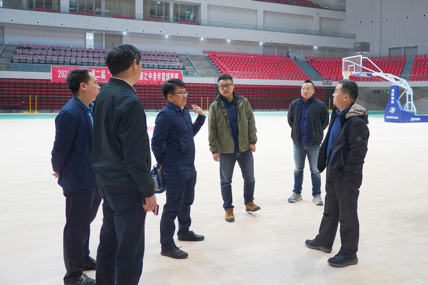 校领导为陈锁明教授(右1)、李鹤老师(右3)介绍我校在市体育中心的课程场地及活动场馆