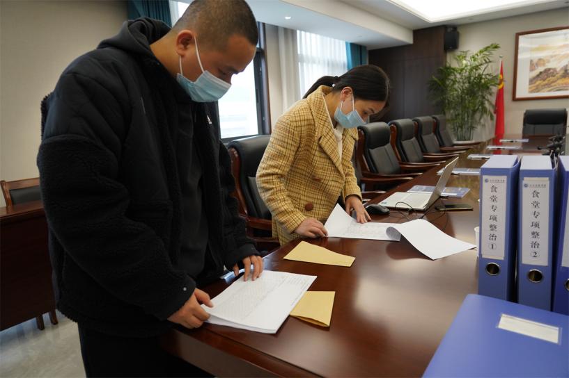 随后,陈洁处长一行查阅了食堂的各类资料台账,对我校食堂工作给予充分肯定,高度评价了食堂的完备设施和规范管理,同时提出了具体的建议。