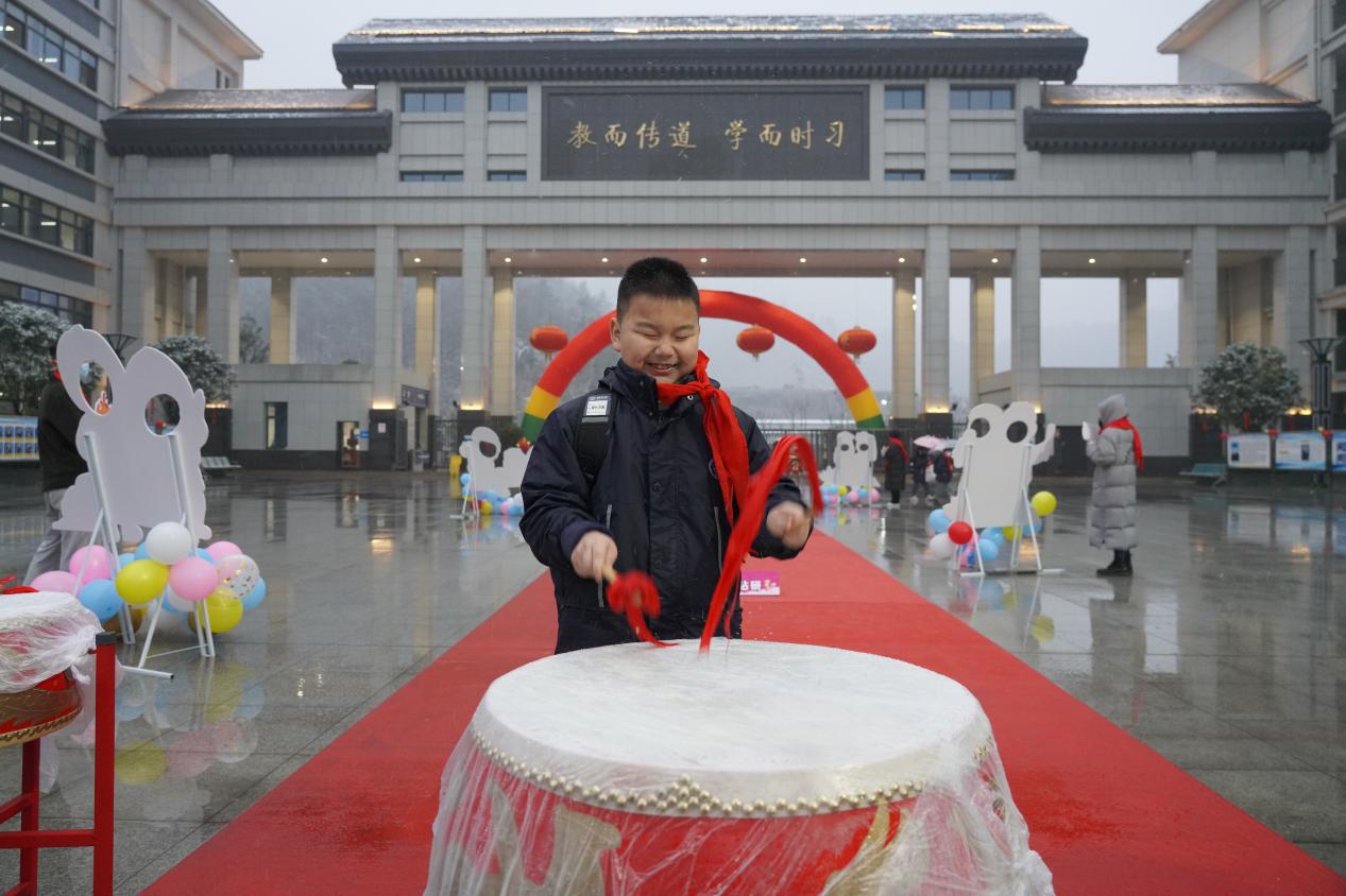 学生们在老师的引导下走过长长的红毯,举起鼓槌,敲出新年的第一声响,预示着新学期学业有成,一鸣惊人。