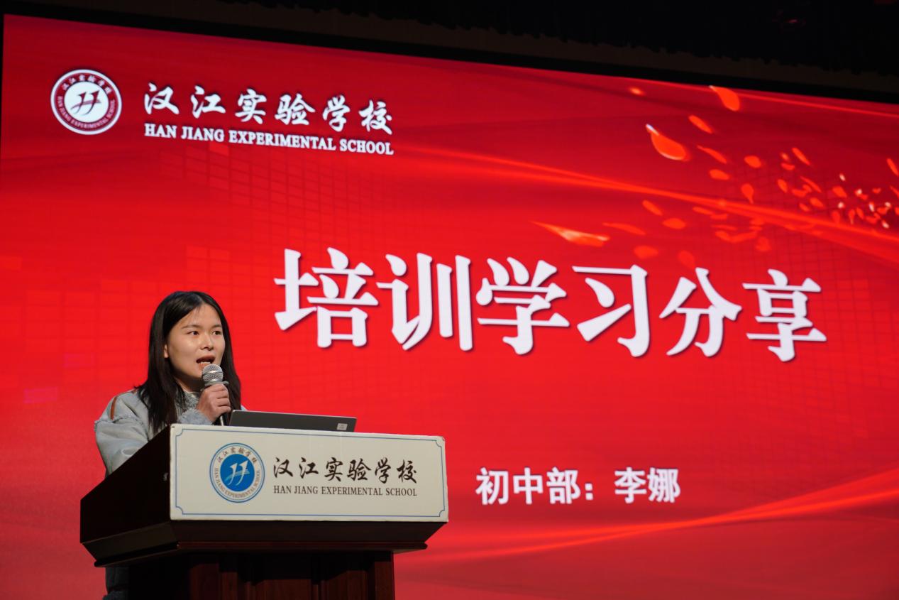 培训结束后,各学部优秀教师代表分别上台分享了自己的学习收获。幼儿园教师顾江微用“幸福、收获、提升”三个关键词总结她的学习体会,就幼儿园日常的工作谈及自己的教学心得,希望自己和汉实大家庭一起争做善于发现、勤于学习、精于练笔的智慧型教师。小学语文教师徐晓丹回忆起她在汉实学习成长的点滴,从“青蓝工程”的帮扶到日常的讲课、评课、磨课,她脚踏实地的积累,勤勉刻苦的钻研,收获了属于自己的教师职业幸福感。初中部英语教师李娜分享了自己参与培训的所想所思,她提到要热爱教师工作,拥有职业认同感和归属感,树立终身学习的教学理念,最终必然会将这份工作尽善尽美。