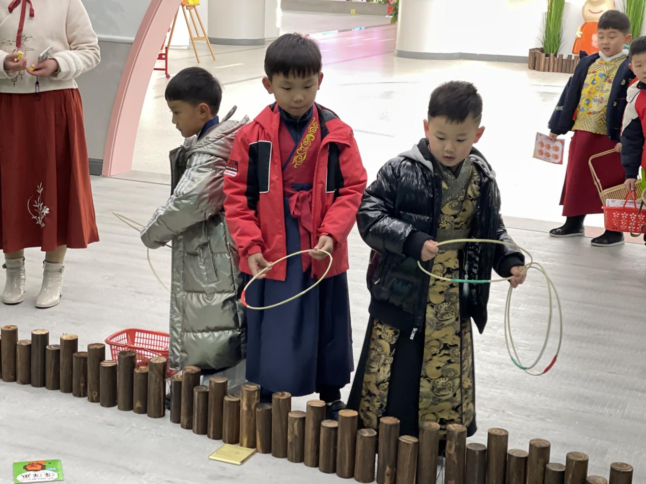 年兽大作战环节中,可爱的汉实萌娃们在老师的带领下,穿梭在投壶游戏、财源广进、一蹴成名、猜谜益智等游戏现场,共同合作完成游戏,赚取粮票。