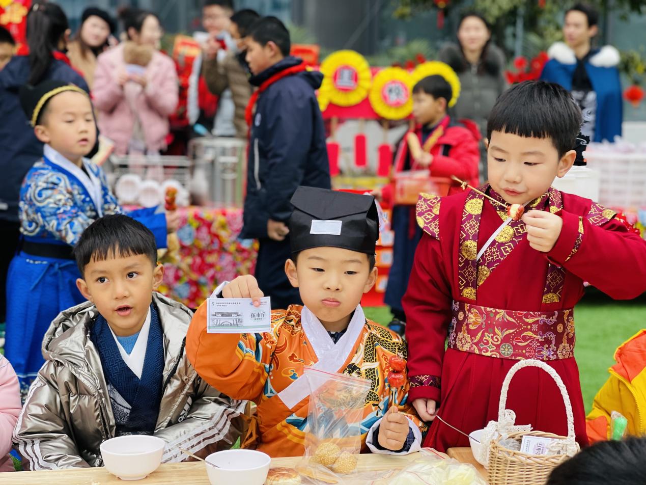 在民俗游玩区,皮影剧场、剪窗花、扎染、活字印刷术......让孩子们亲身参与种类多样的传统活动,了解传统民俗文化。在民俗美食区,孩子们有序排队,用自己赚来的粮票换取喜欢的美食,个个都喜笑颜开。