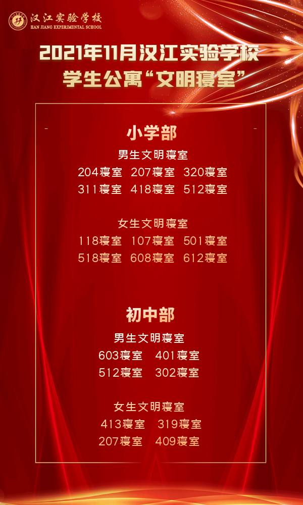 为创建团结和谐、积极向上、安全卫生的学习和生活环境,进一步加强我校对寝室、班级的管理和建设,汉江实验学校定期开展文明班级与文明寝室评比活动。