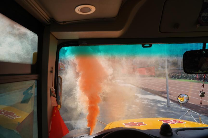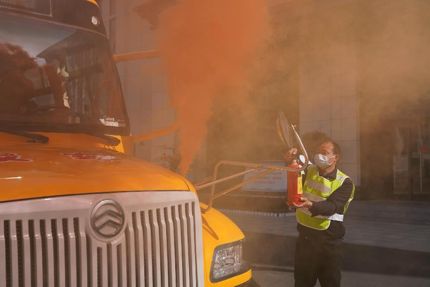 演练开始,车内出现火警,学生呼喊警示车内起火,车辆紧急??恐涟踩?,驾驶员车后紧急摆放三角警示牌,立即取出车载灭火器灭火,各个环节干净利索,反应迅速。学生们在老师指挥下,沉着冷静,遵从口令,一律按照正确的逃生方法,捂住口鼻迅速有序地撤离到安全地点。老师及时稳定现场学生情绪,清点人数后迅速报警,并立即向学校报告情况。整个过程紧张、有序,演练顺利完成。