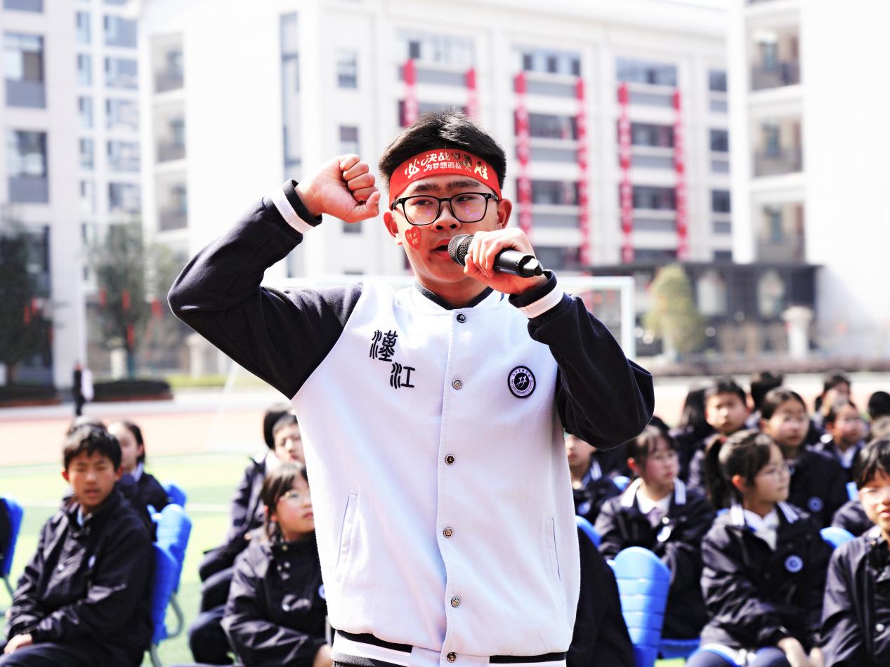 九年级学生代表梁添福同学回忆了在汉实拼搏奋斗的初中生活,有庆幸,有感恩,而更多的是坚定不移的奋斗。中考百日,他号召同学们:直面现实、展望未来、只争朝夕、不负韶华!立壮志,展雄风,振翅搏长空;战百日,向前冲,立誓上一中!