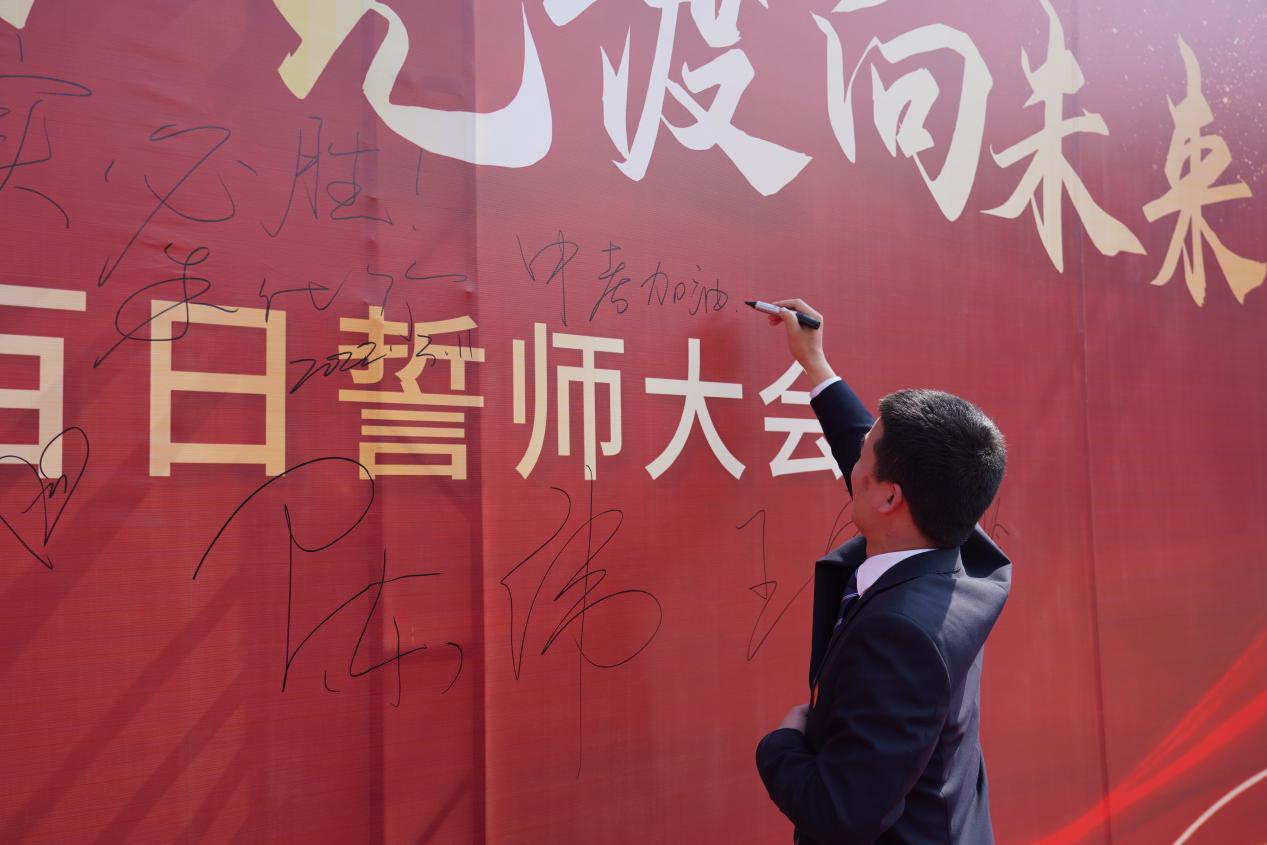 九年级历史教师杨耀林带领全体九年级教师郑重宣誓,教师们那铿锵有力,沉稳坚定的呐喊,传达着最庄严的承诺。在这一百天里,所有的老师都会陪伴着同学们,用爱与责任铺设冲刺的红毯,在胜利的终点手捧鲜花等待凯旋。