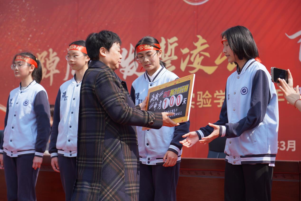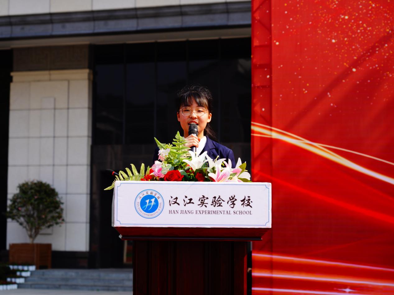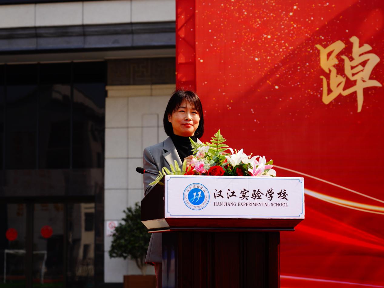 每一点进步,每一份成长,都有父母爱的力量,有父母做同学们坚强的后盾。九(1)班齐妙同学的妈妈——朱晓华女士作为家长代表发言。她代表全体家长感谢汉江实验学校这个优秀的平台,并向辛勤耕耘的老师们表示感谢。她希望同学们在最后一百天里拼搏奋进、无愧于心,虽然这一百天里会有焦虑、疲惫等情绪出现,但这些都会成就最珍贵的经验、最美好的经历。最后,她呼吁家长们善关怀,会疏导,为孩子营造良好的家庭氛围,少一点压力,多一份关怀。